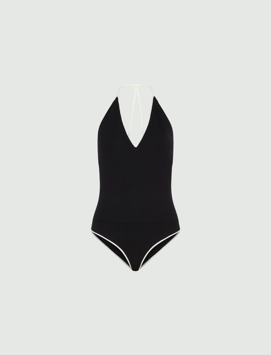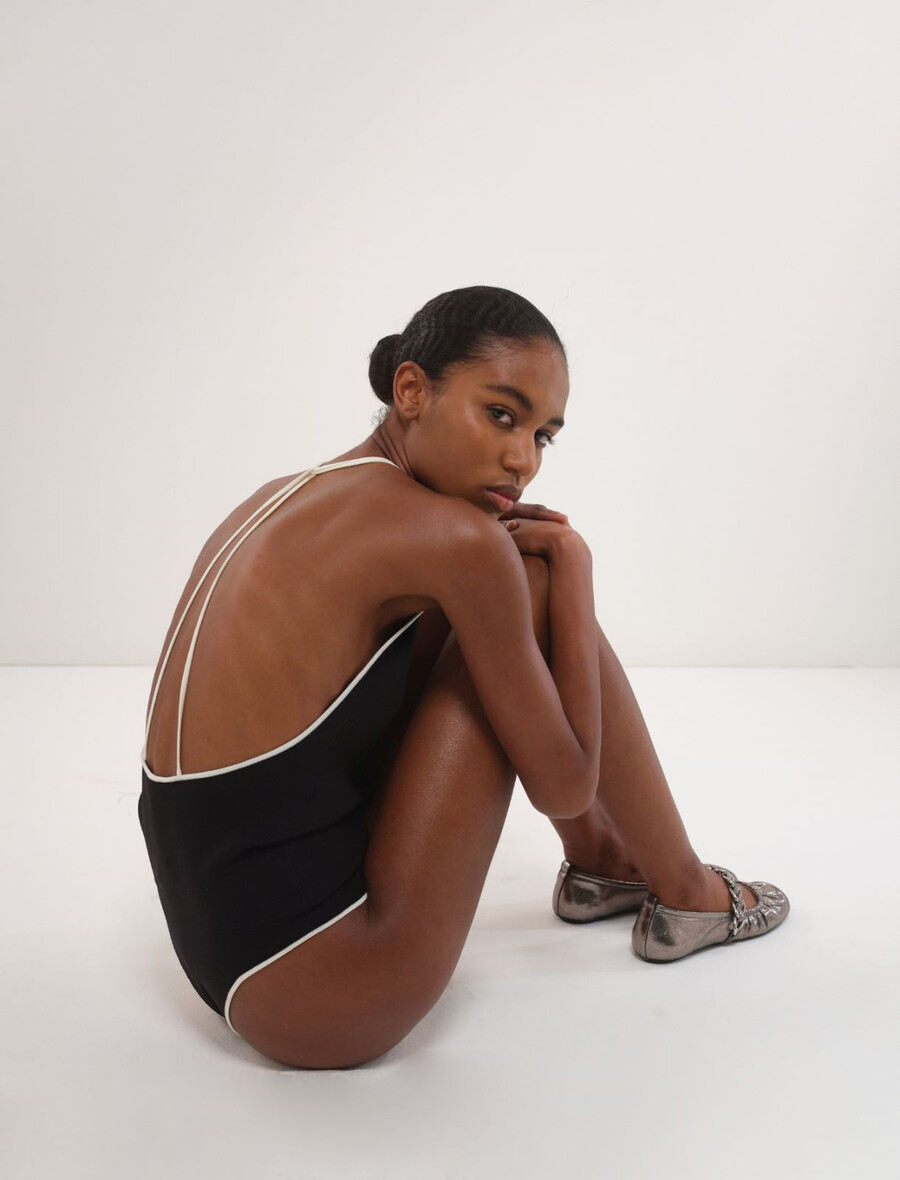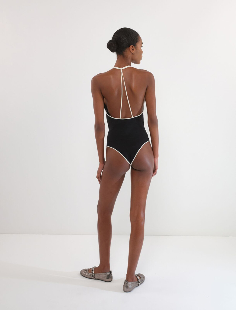 Sophistiqué sous un blazer et élégant avec un pantalon : ce body à col V est orné de finitions et de bretelles contrastées.