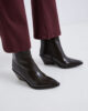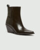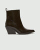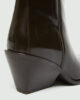 Bottes montantes d’inspiration cowboy. Ce modèle présente un bout pointu, un talon large et une silhouette diagonale. La trépointe saillante apporte une touche audacieuse.