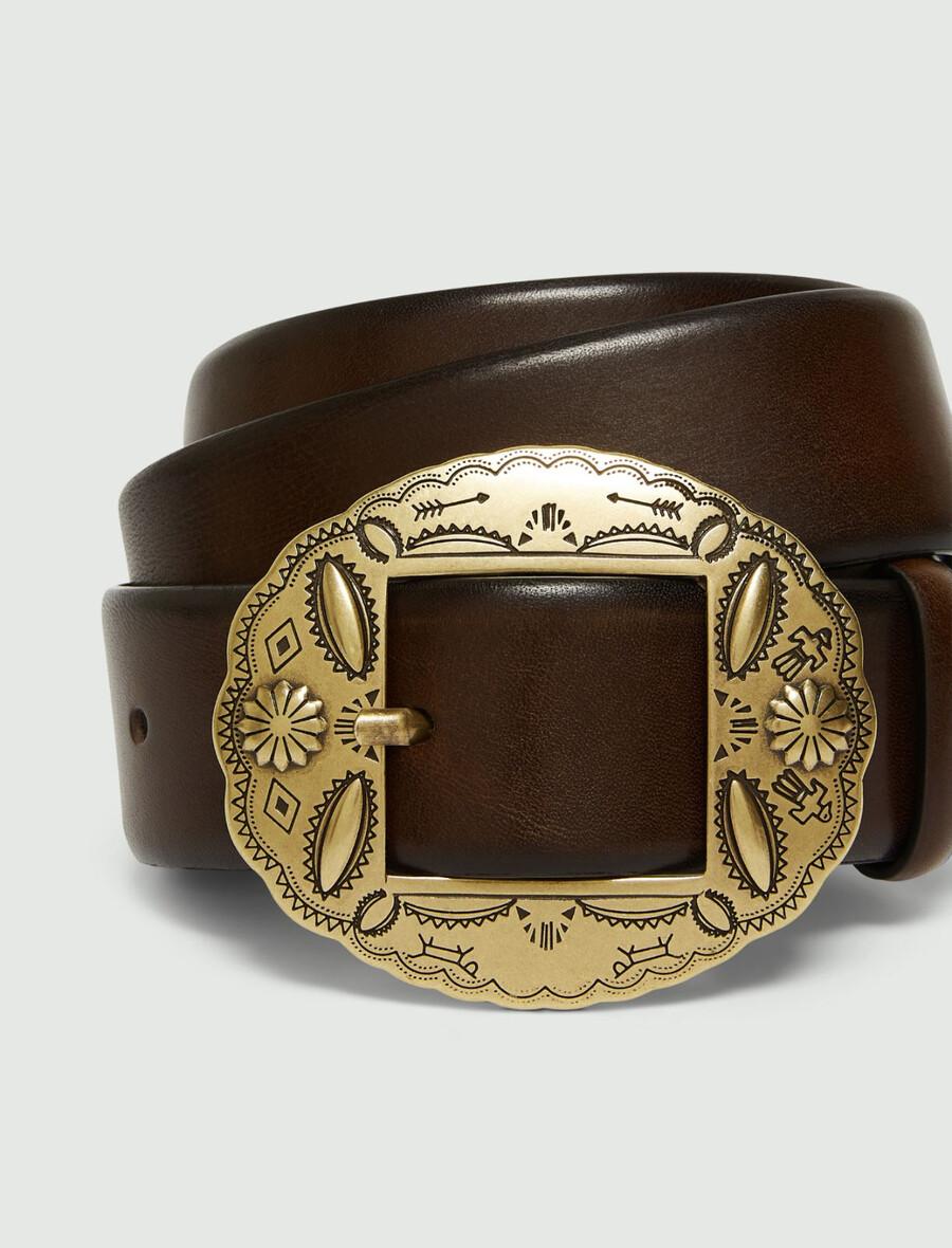 Une ceinture en cuir au design affirmé et à la boucle pleine de caractère : son motif sophistiqué et sa forme inspirée du style western chic ne manqueront pas d’attirer les regards.