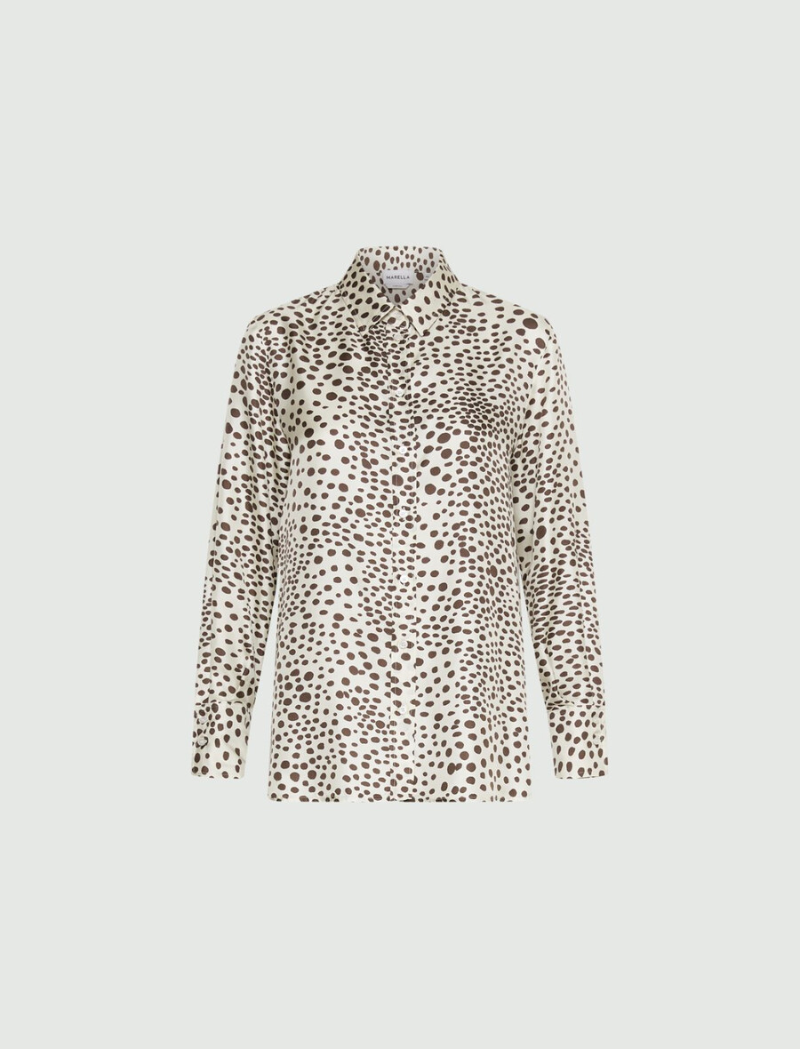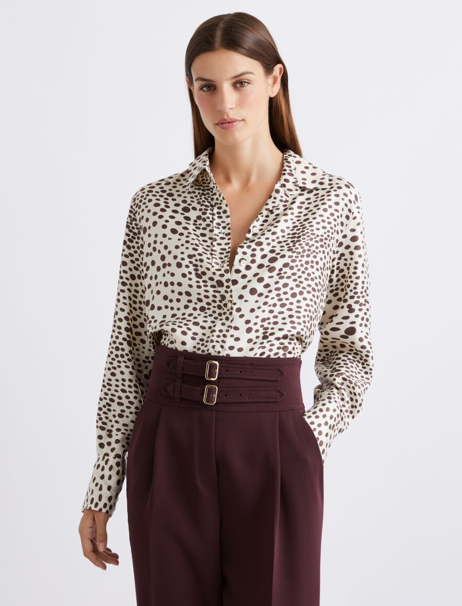 Cette chemise en twill de soie arbore un imprimé audacieux. Fluide et élégante, elle se marie parfaitement avec un pantalon tailleur et surprend agréablement avec un jean et des ballerines.