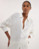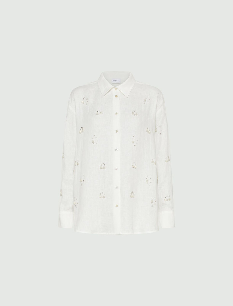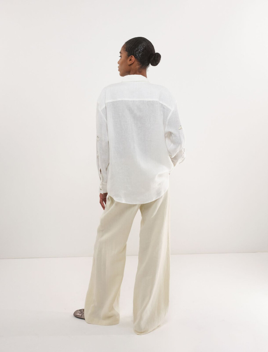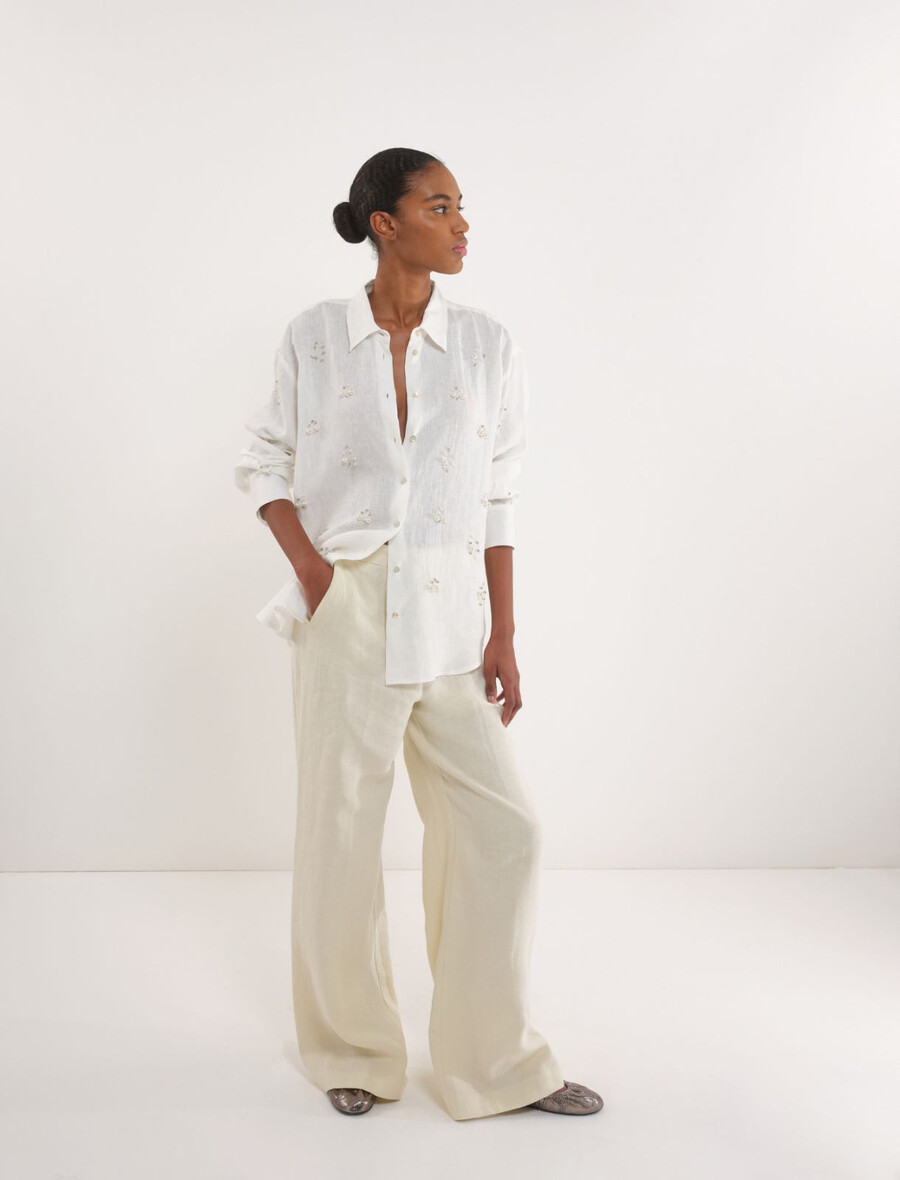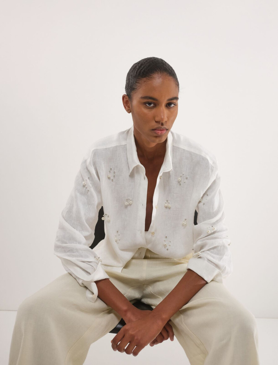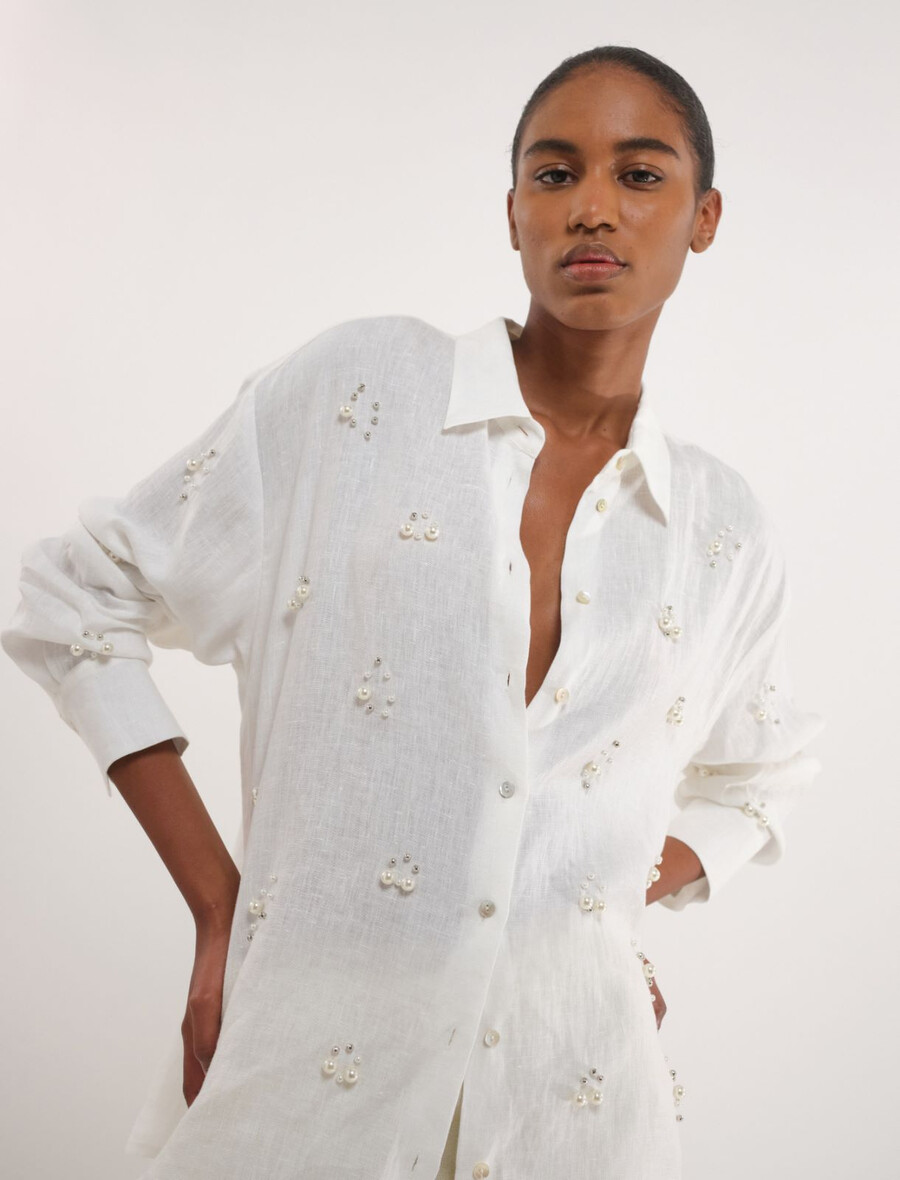 Une version moderne et décontractée de la chemise en lin, avec des épaules tombantes et des broderies scintillantes, des perles et des clous. Complétez votre look avec des bijoux fantaisie et un pantalon fluide pour une allure citadine parfaite.