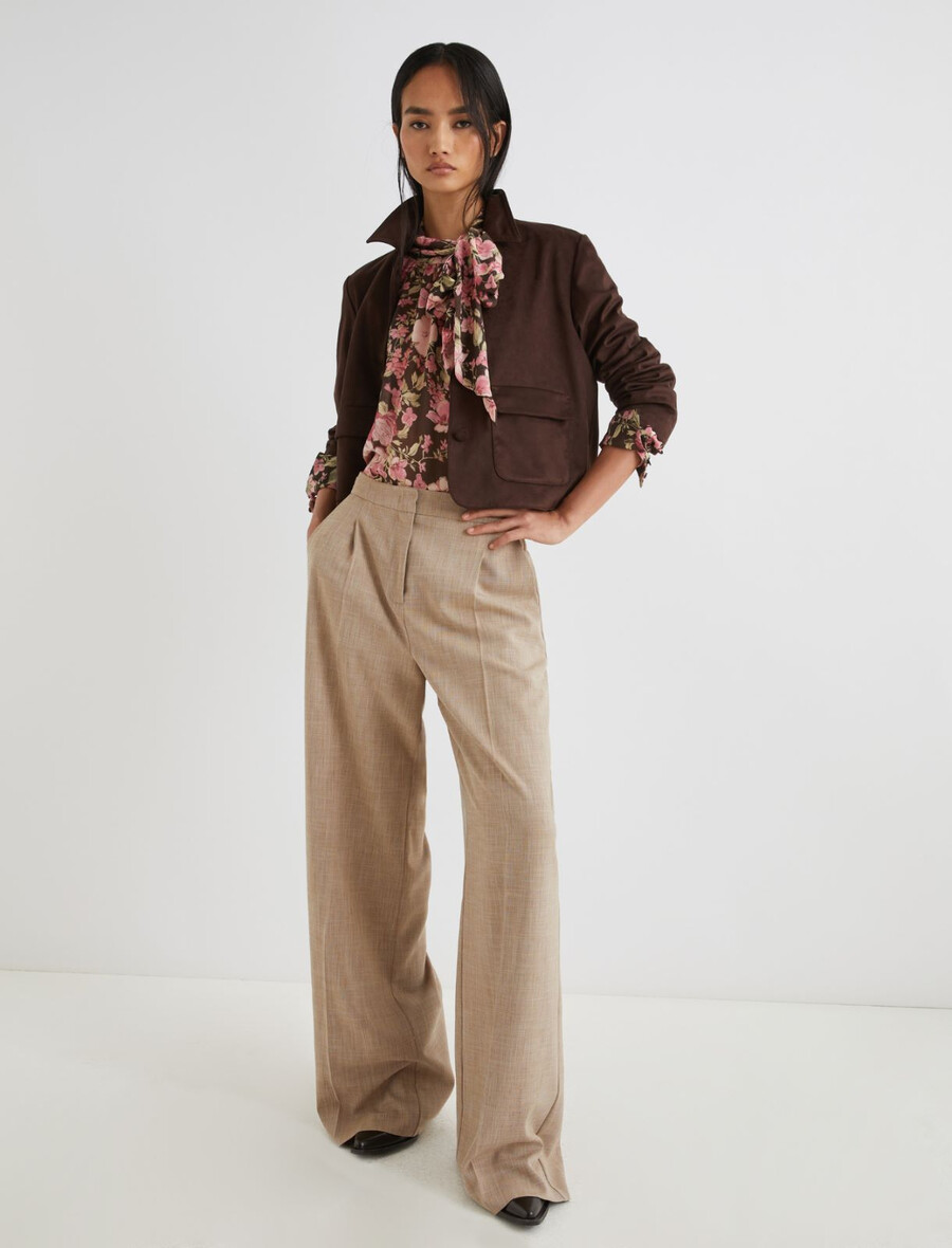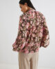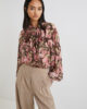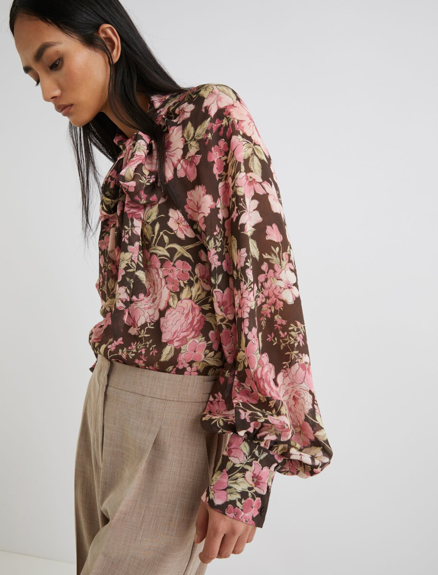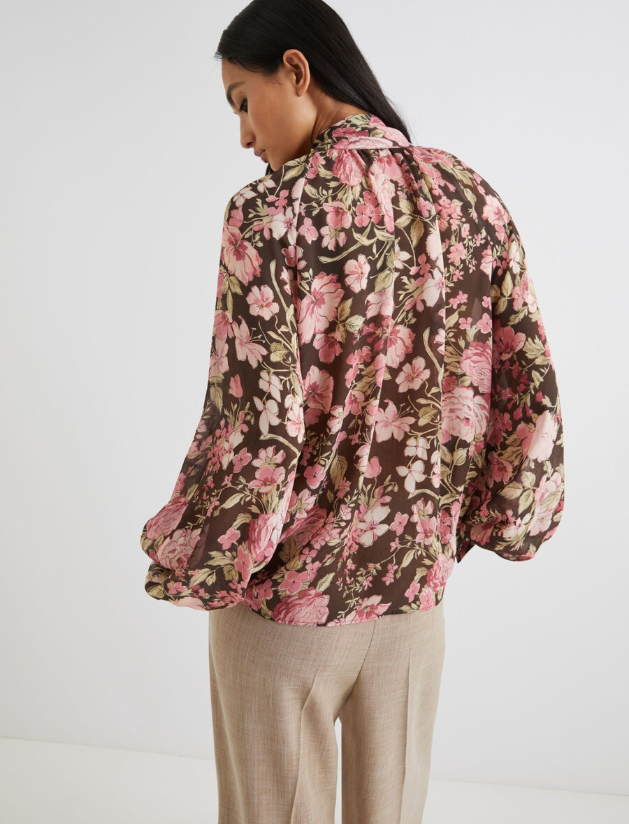 Ce chemisier en georgette à la coupe décontractée, orné d’un foulard à nouer autour du cou, présente un motif floral éclatant. À porter avec une veste courte assortie et un pantalon fluide pour un look décontracté et ultra-féminin.