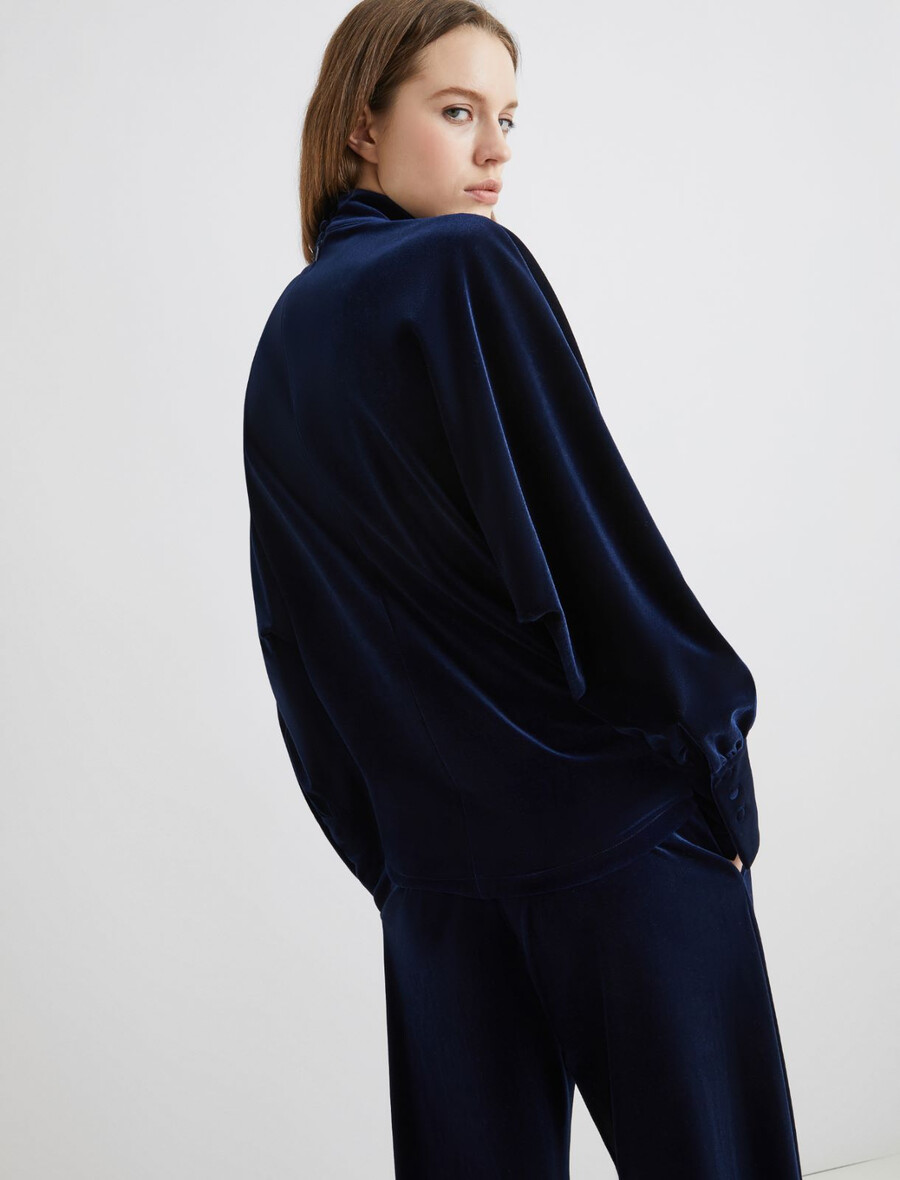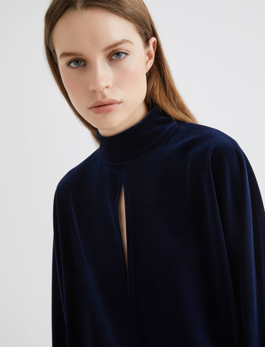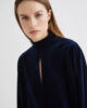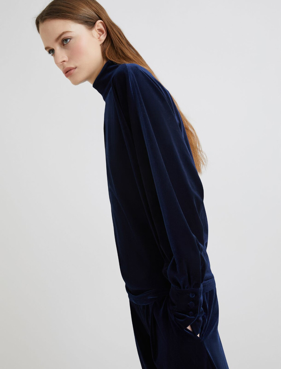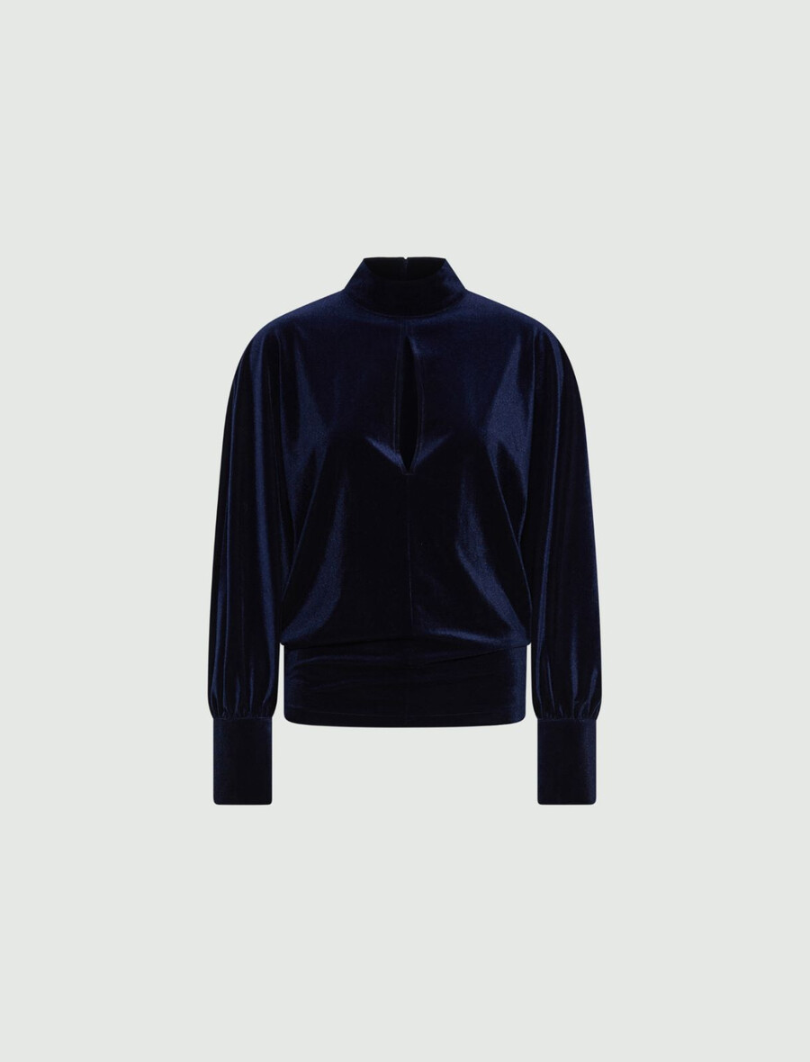 Le chemisier en velours dont vous ignoriez l’existence : ce modèle présente des manches amples, un col montant et une découpe audacieuse sur le devant pour un look ultra-séduisant.