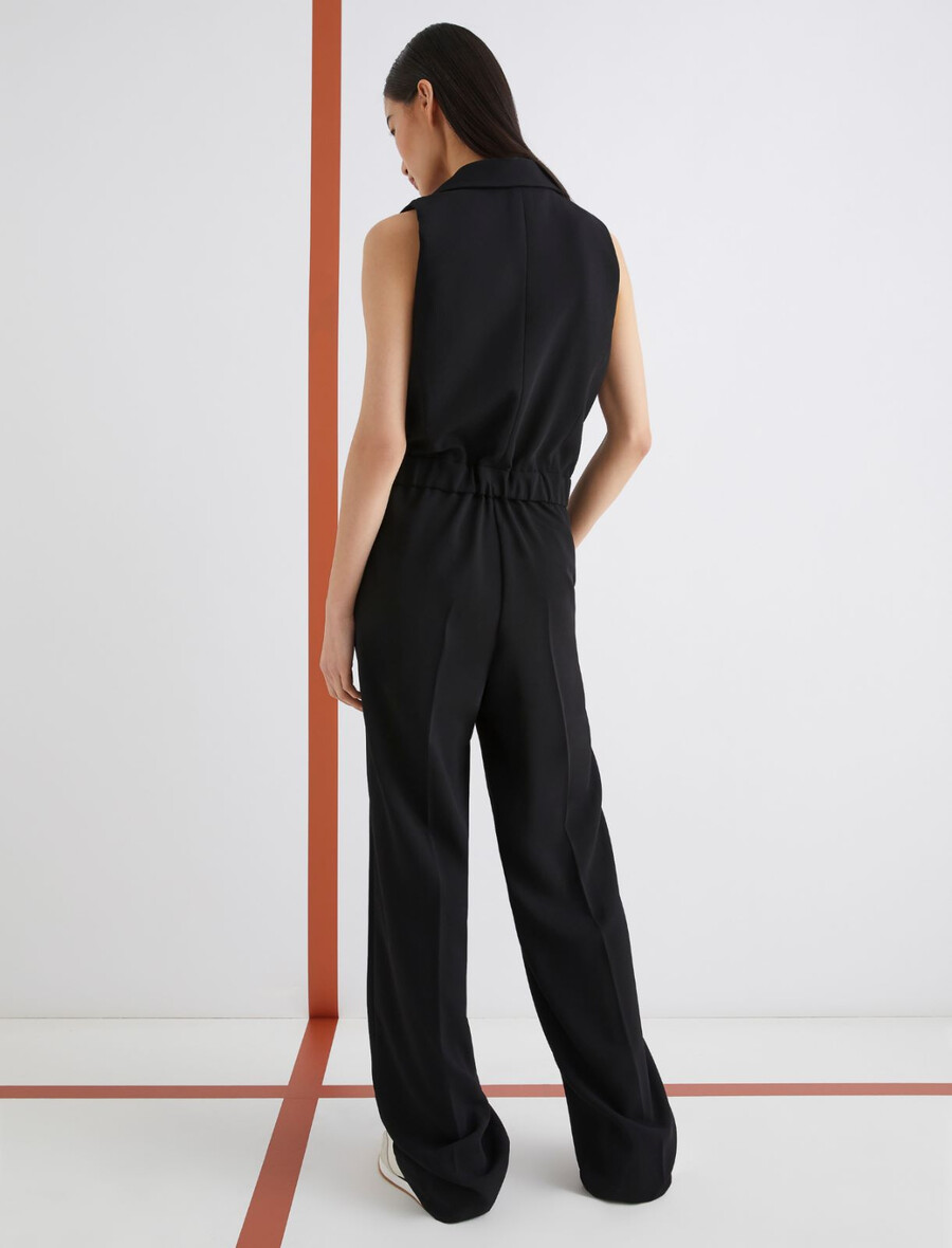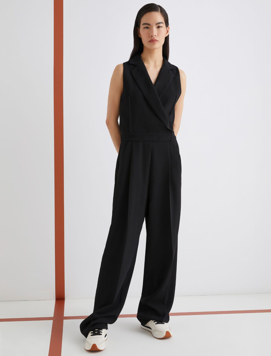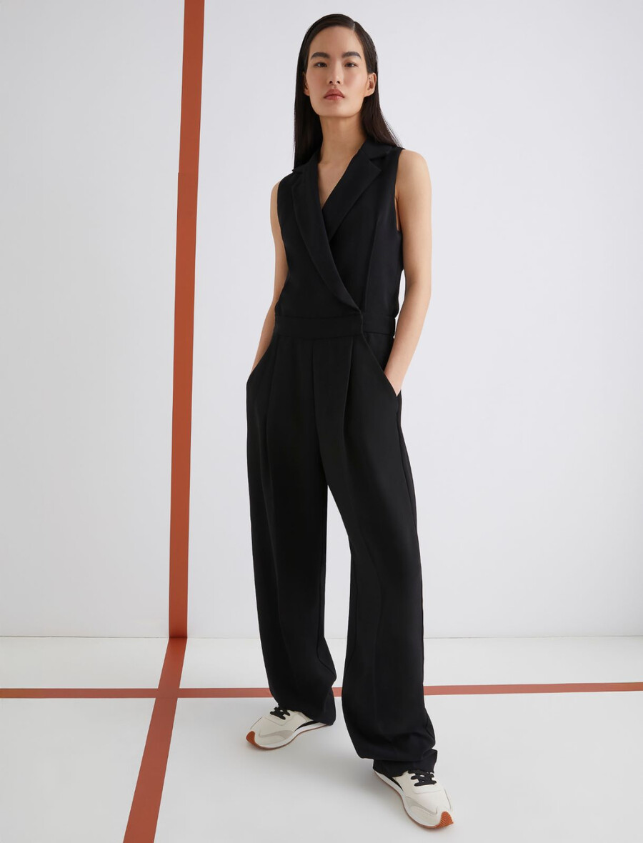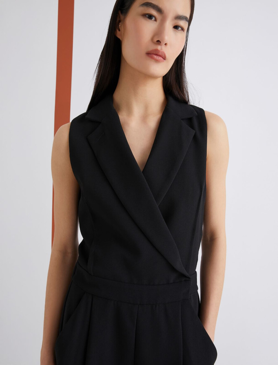 Cette combinaison sans manches en satin envers présente une coupe féminine et un col à revers. Idéale pour un look complet : elle se marie subtilement avec des baskets ou des escarpins pour transformer votre style en un clin d’œil.