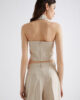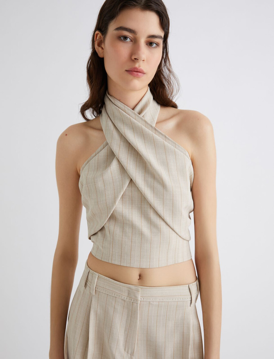 Le nouveau top iconique de la saison présente une coupe courte, un décolleté épaules dénudées et un détail croisé sensuel sur le devant. Élégance urbaine et sensualité s’y conjuguent à la perfection.