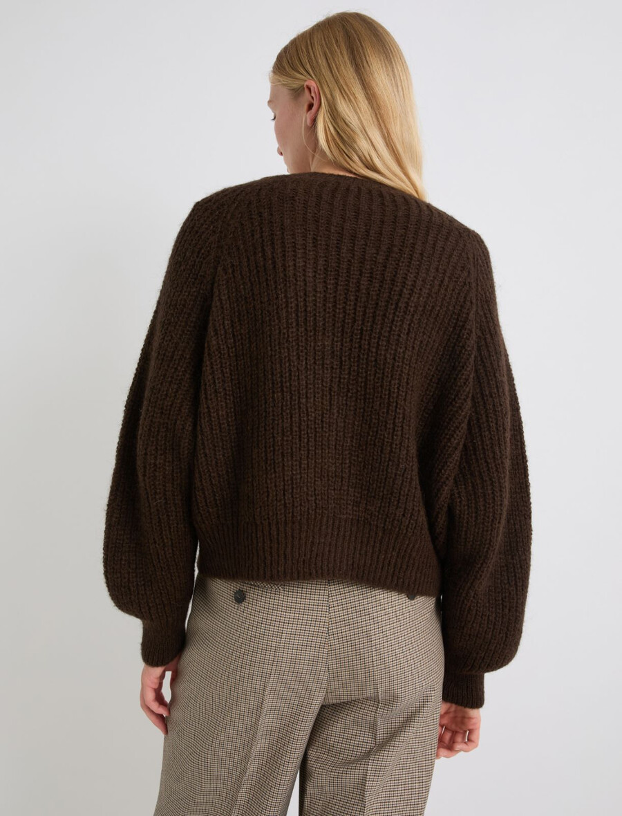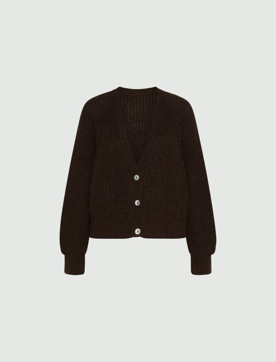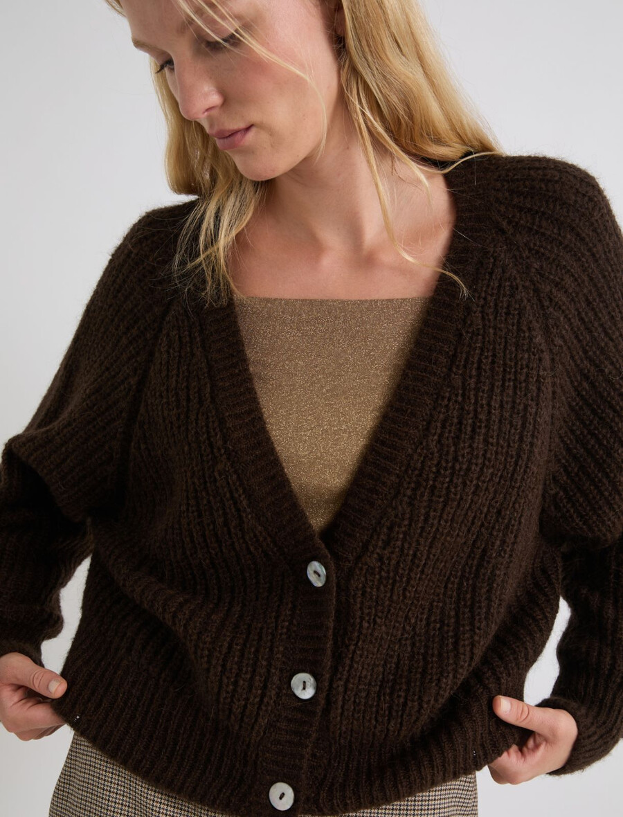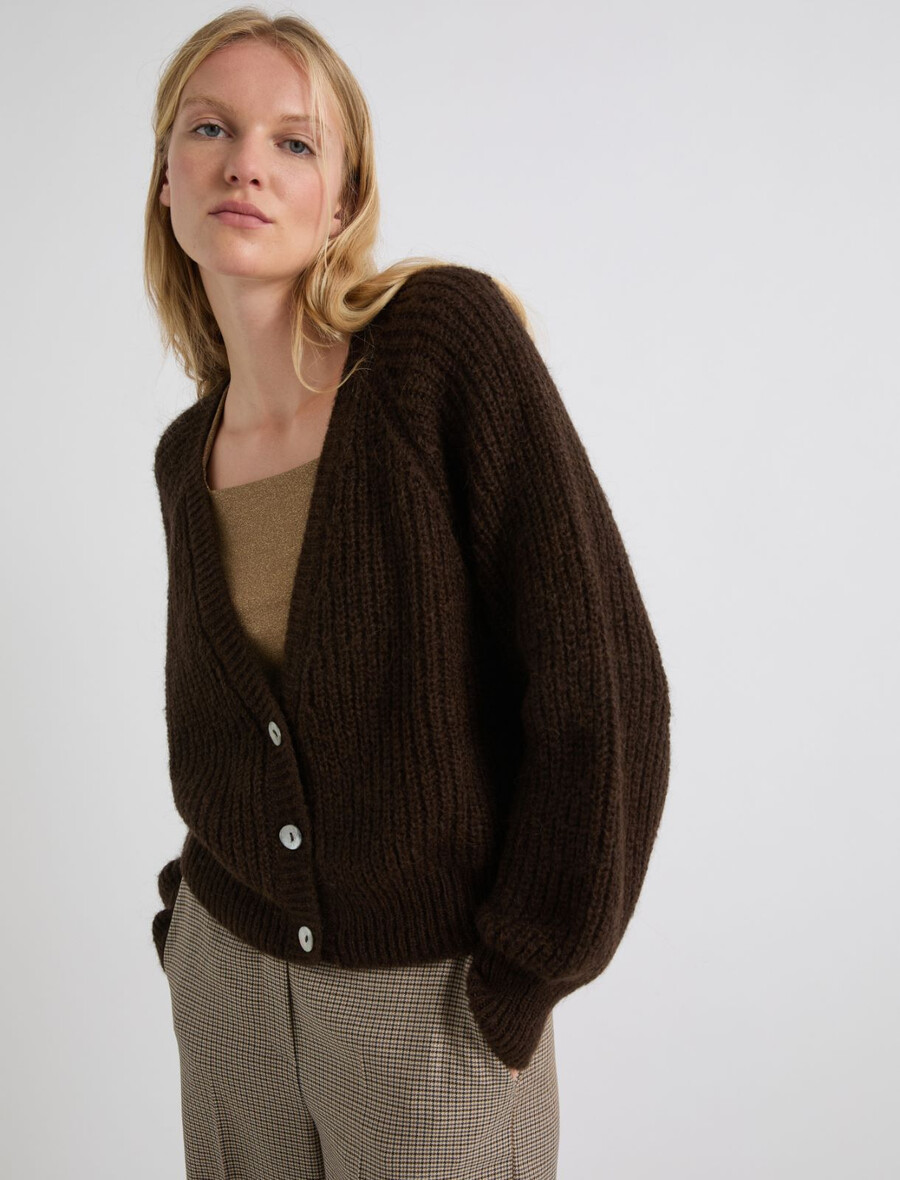 Ce cardigan chaud et enveloppant est la pièce la plus polyvalente de la saison : des teintes profondes, un tricot mi-bricole pour une texture riche et d’élégants boutons en nacre.