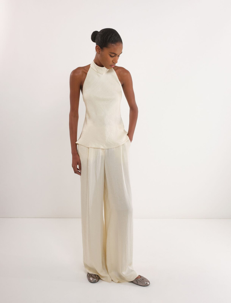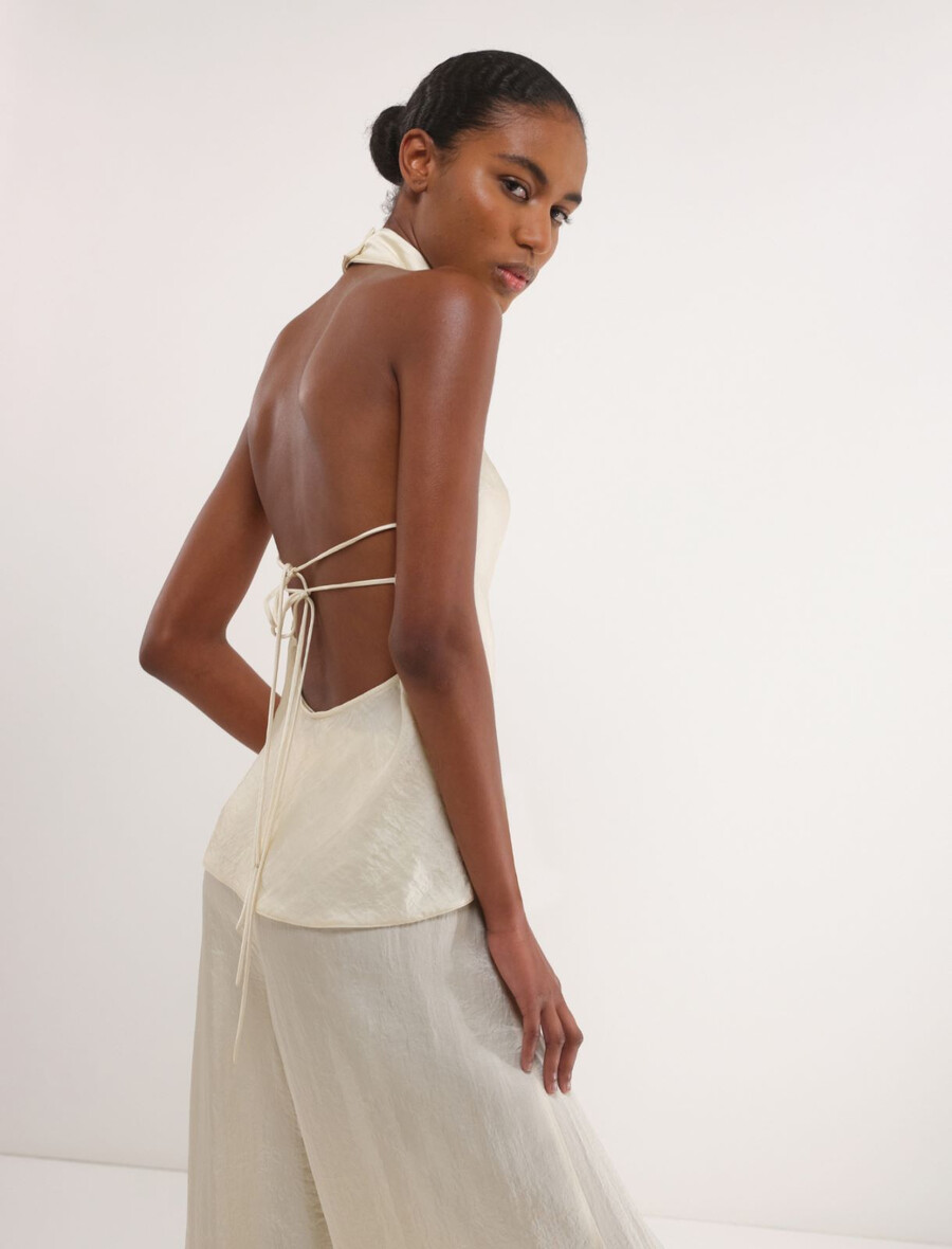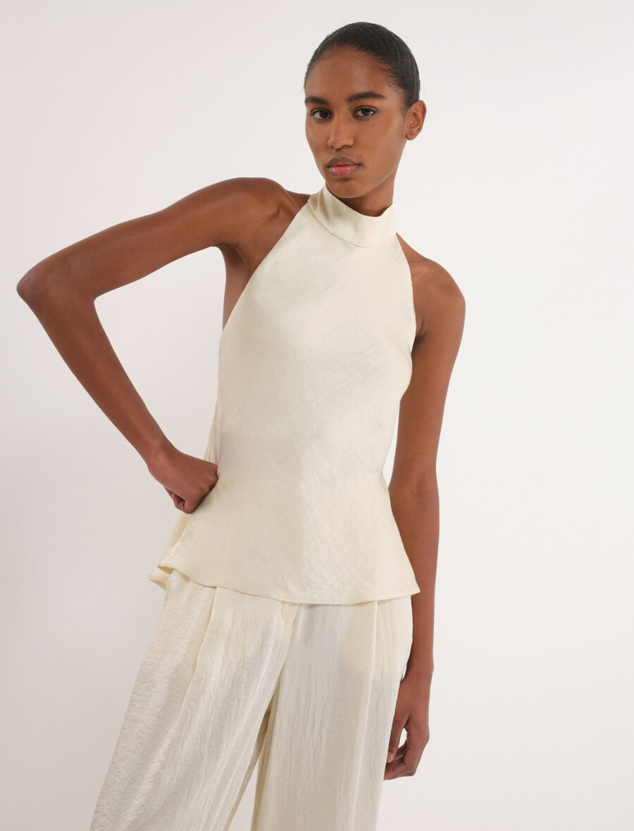 Ce nouveau top fluide à col halter dévoile les épaules et ne manquera pas de faire sensation. L’effet froissé du tissu lui confère une touche raffinée, idéale pour les occasions les plus chics.