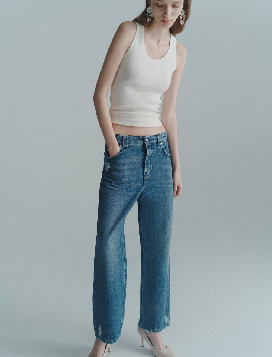 L’élégance du denim avec une touche urbaine : ce nouveau jean mom fit est toujours confortable et tendance. À porter avec un pull marin intemporel, des escarpins et une pochette pour un look décontracté.