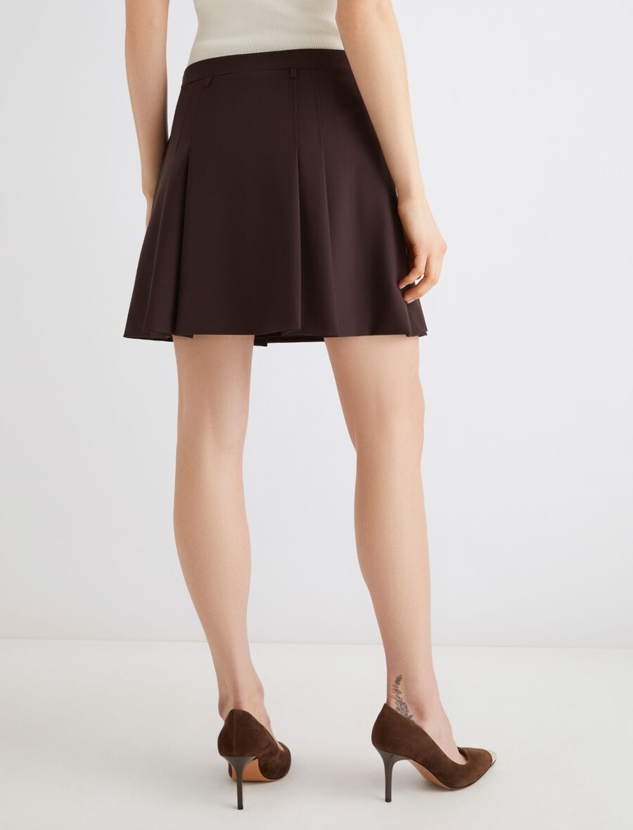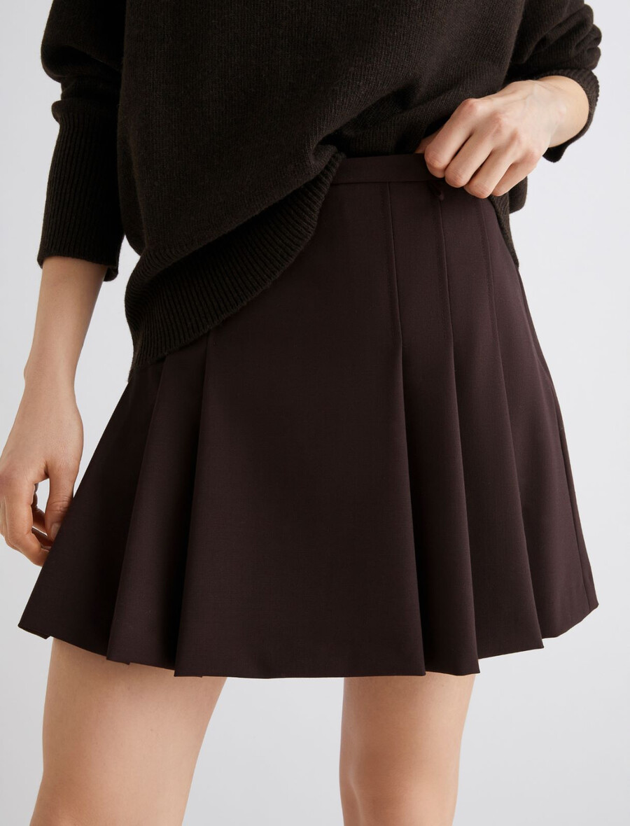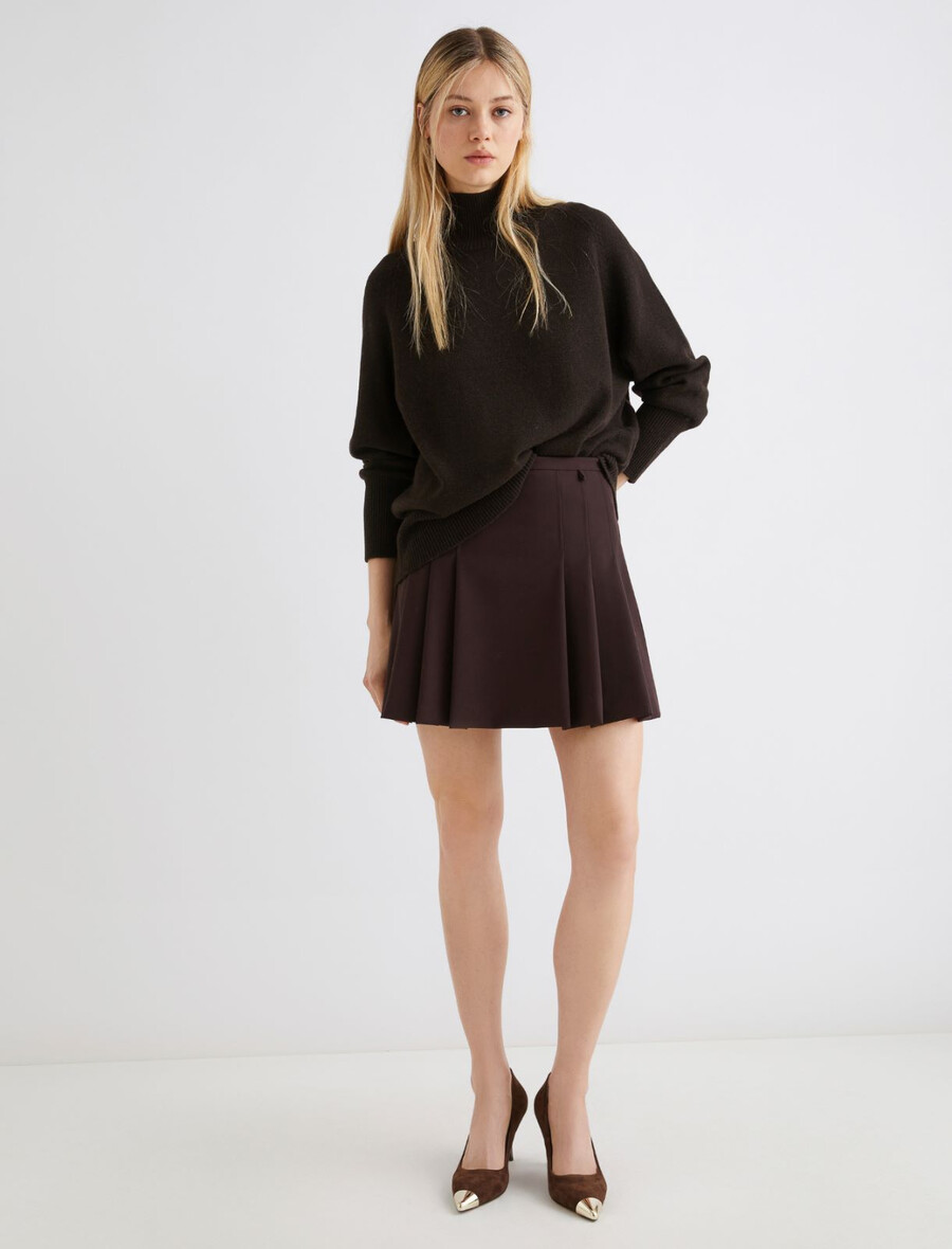 Cette jupe plissée sur le devant suit les tendances de la saison : à la fois élégante et dynamique, grâce à ses multiples plis subtils qui s’ouvrent vers l’ourlet.