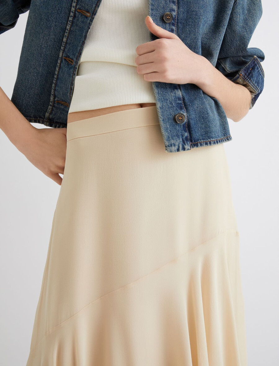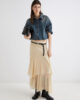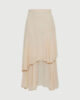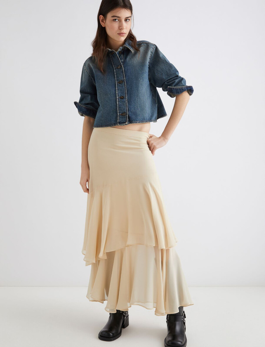 Jupe en georgette de soie pure, ornée d’un double volant asymétrique à l’ourlet pour une coupe dynamique et une touche romantique. Polyvalente, elle convient aussi bien aux occasions spéciales qu’à la ville, portée avec une chemise en jean et des bottines.