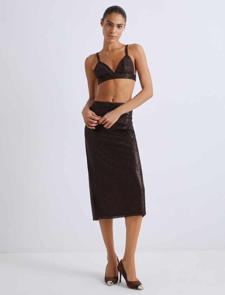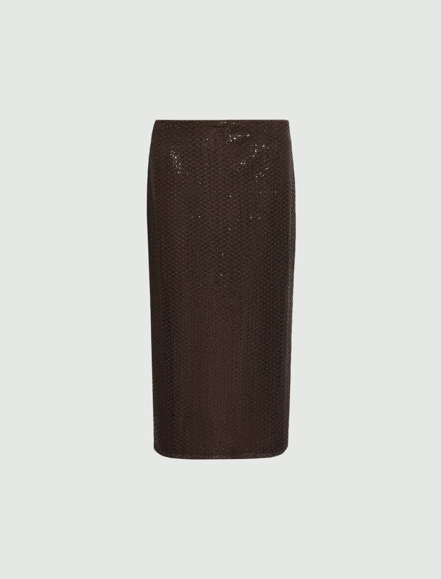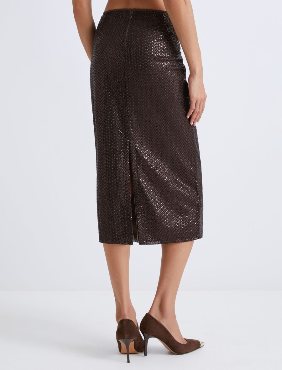 Une version glamour de la jupe mi-mollet classique, avec une coupe droite et une taille marquée pour un look plus moderne. Les broderies de sequins sur toute la jupe créent un effet brillant, idéal du matin au soir.