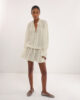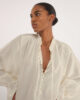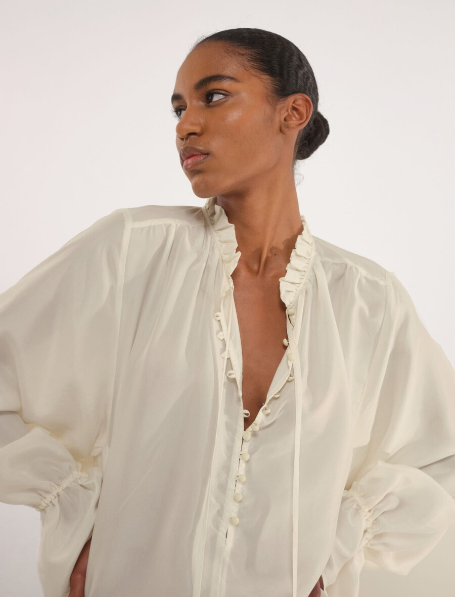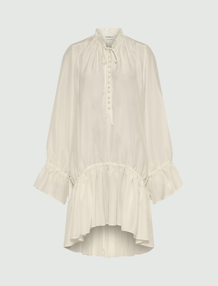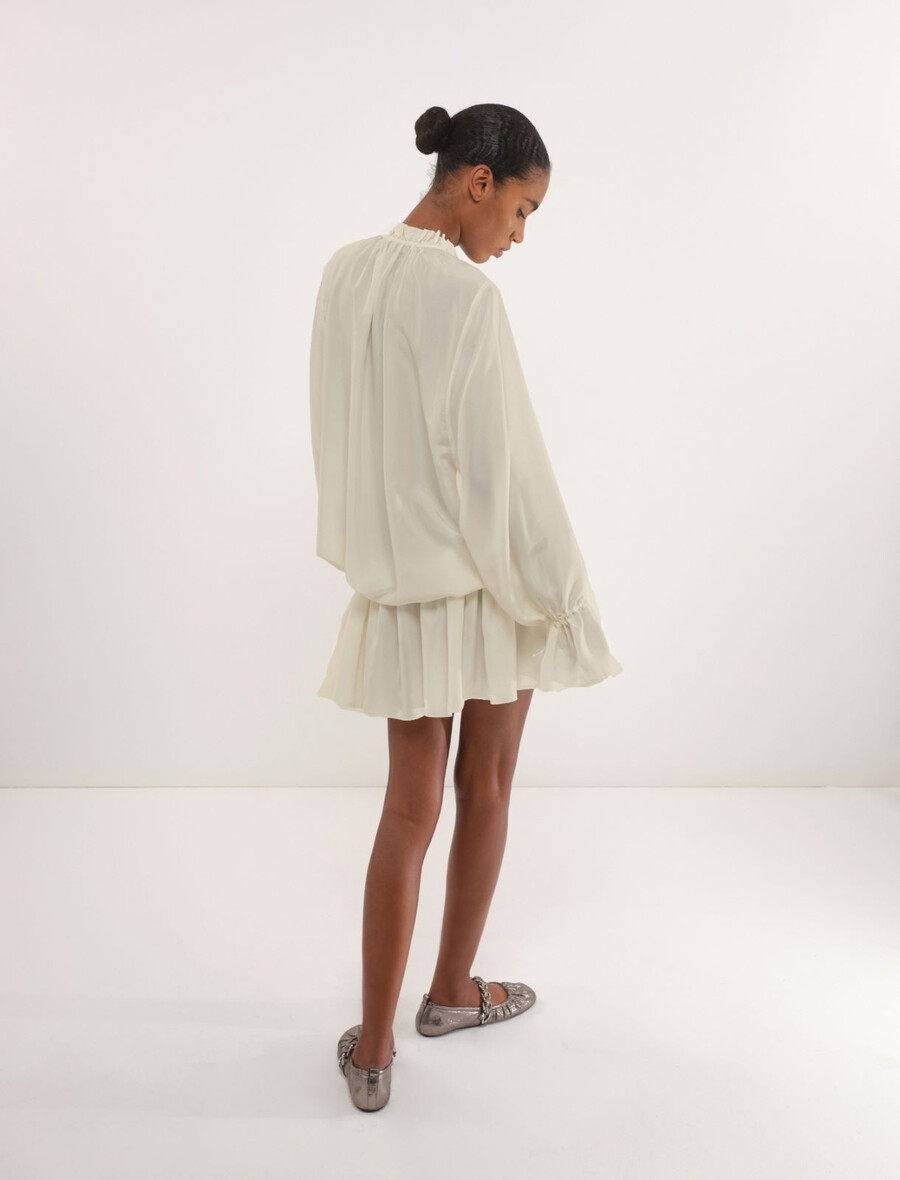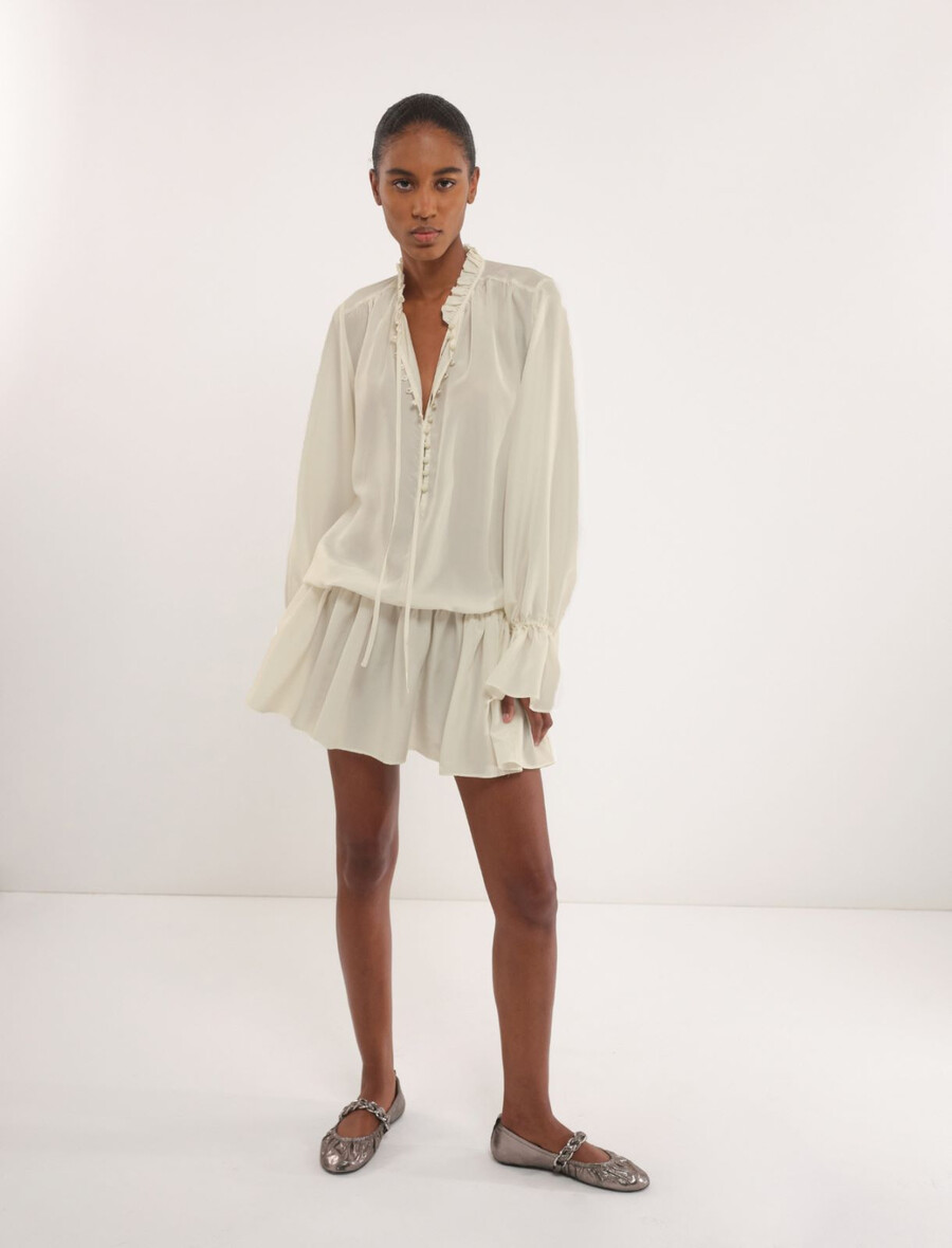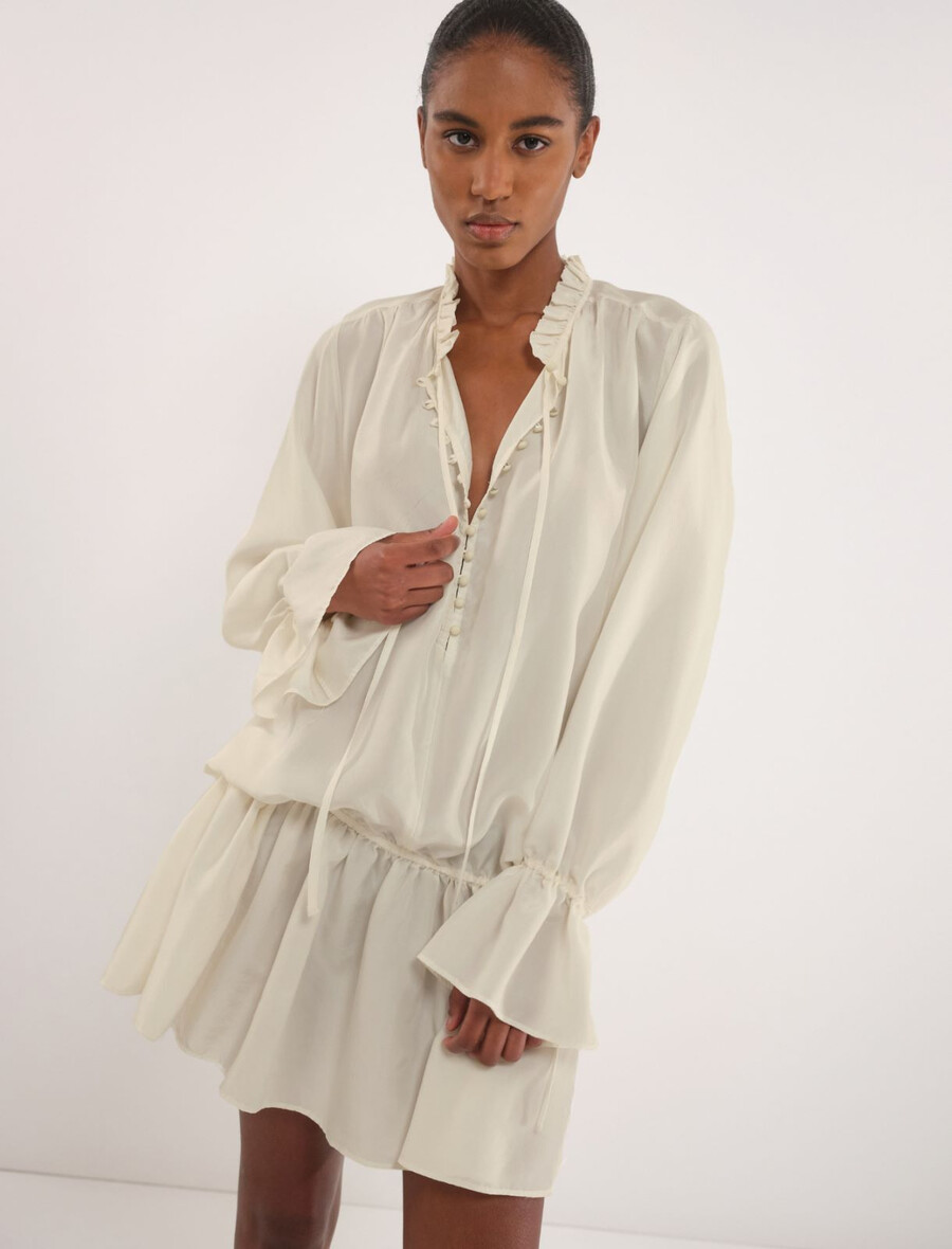 Cette robe aux détails bohèmes inspirés des chemises dégage un romantisme nouveau, teinté de nuances lumineuses et de fronces vaporeuses. Elle présente un détail volanté au col et une coupe évasée.
