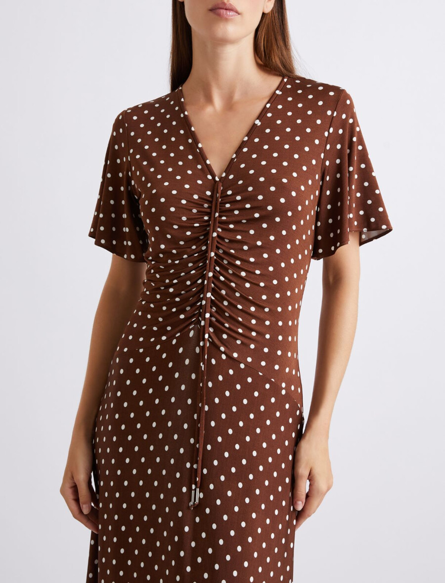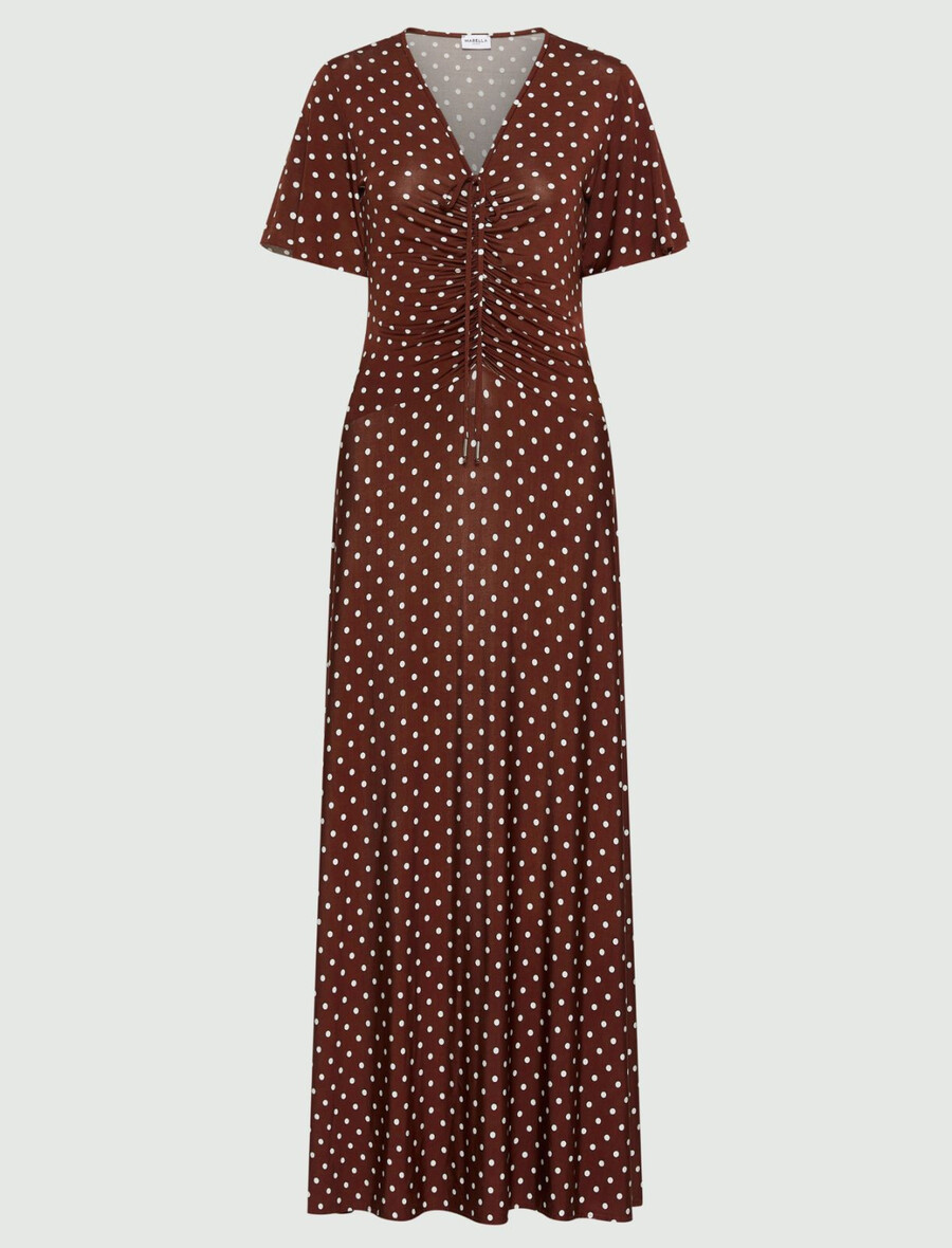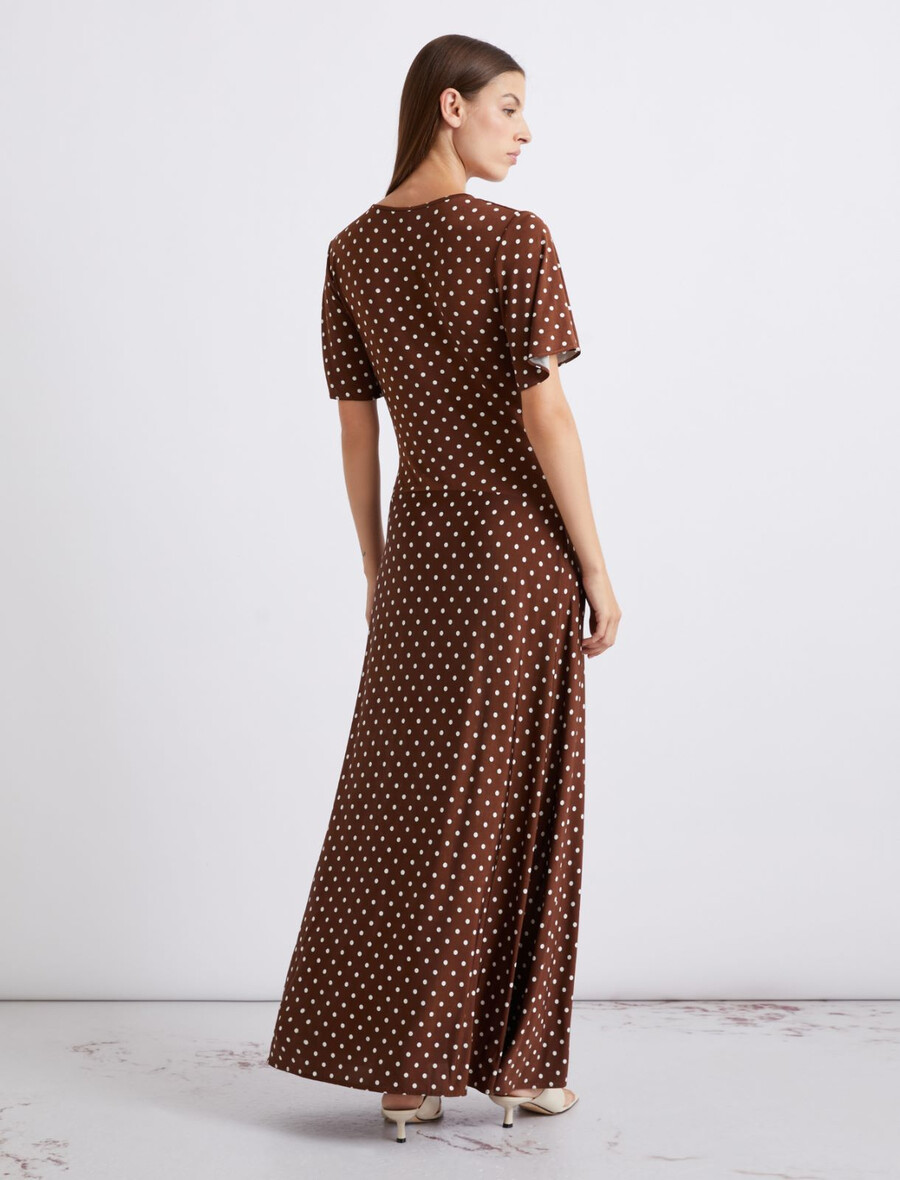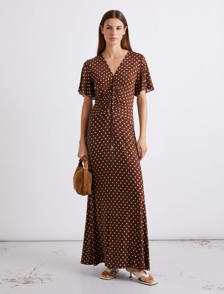 Les pois, l’un des grands retours de cette saison, sont bien décidés à s’installer durablement. Ils apportent une touche légère et ludique à cette robe longue cintrée et évasée, la rendant parfaite pour les occasions décontractées.