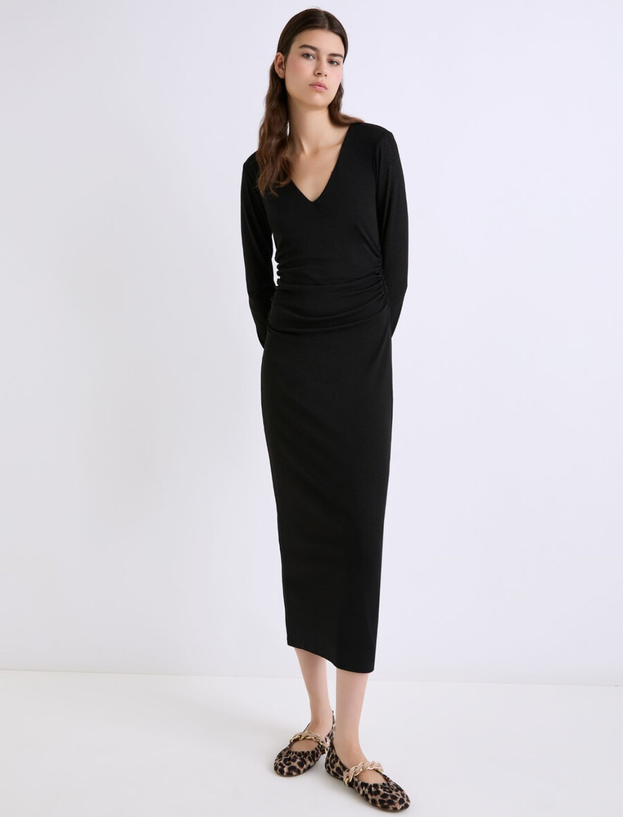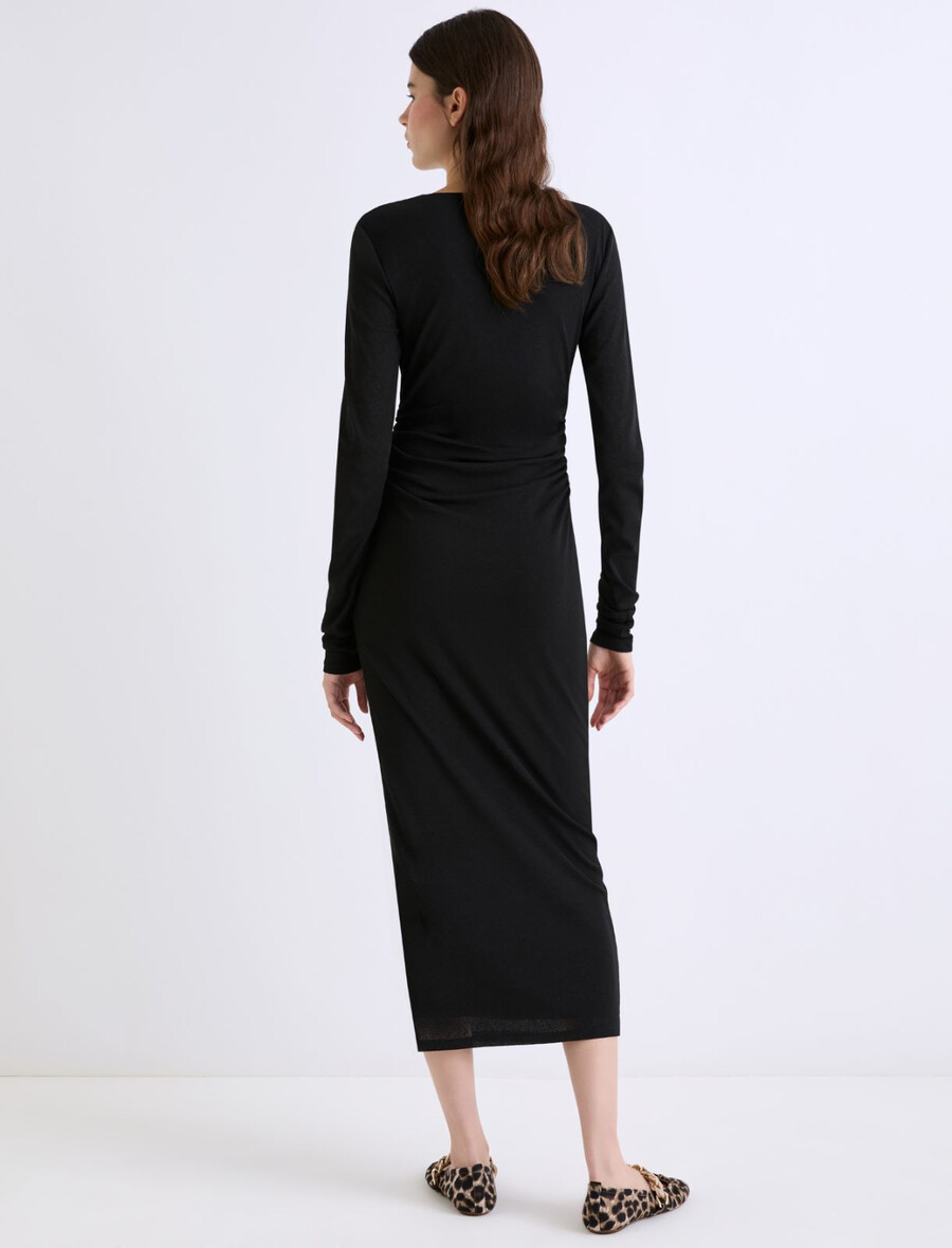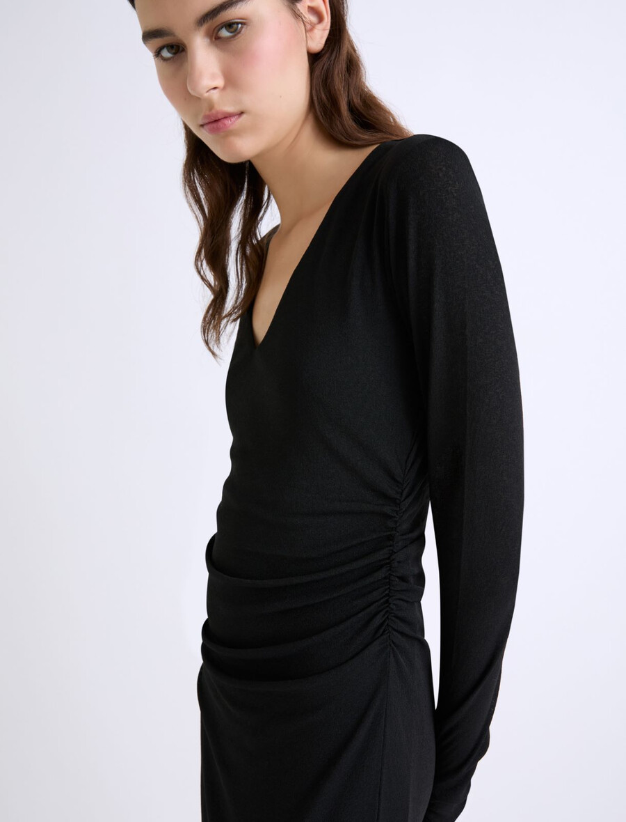 Une version urbaine de la robe en jersey de tulle, avec une coupe droite et un détail froncé moderne sur les côtés. Non doublée pour plus de légèreté, elle se marie parfaitement avec des bottines motardes et une ceinture rock.