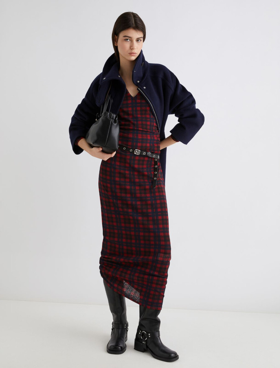 Une version urbaine de la robe en jersey de tulle, avec une coupe droite et un détail froncé moderne sur les côtés. Non doublée pour plus de légèreté, elle se marie parfaitement avec des bottines motardes et une ceinture rock.