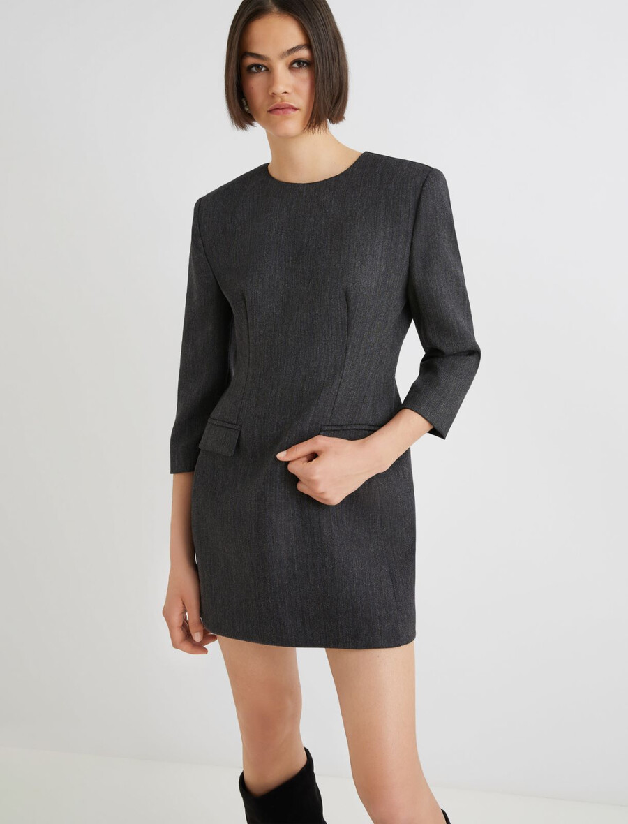 Cette nouvelle mini-robe affiche une allure citadine grâce à son corsage à la coupe nette et ses poches latérales façon blazer. Portez-la avec des bottines souples et un long manteau pour un style affirmé.
