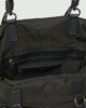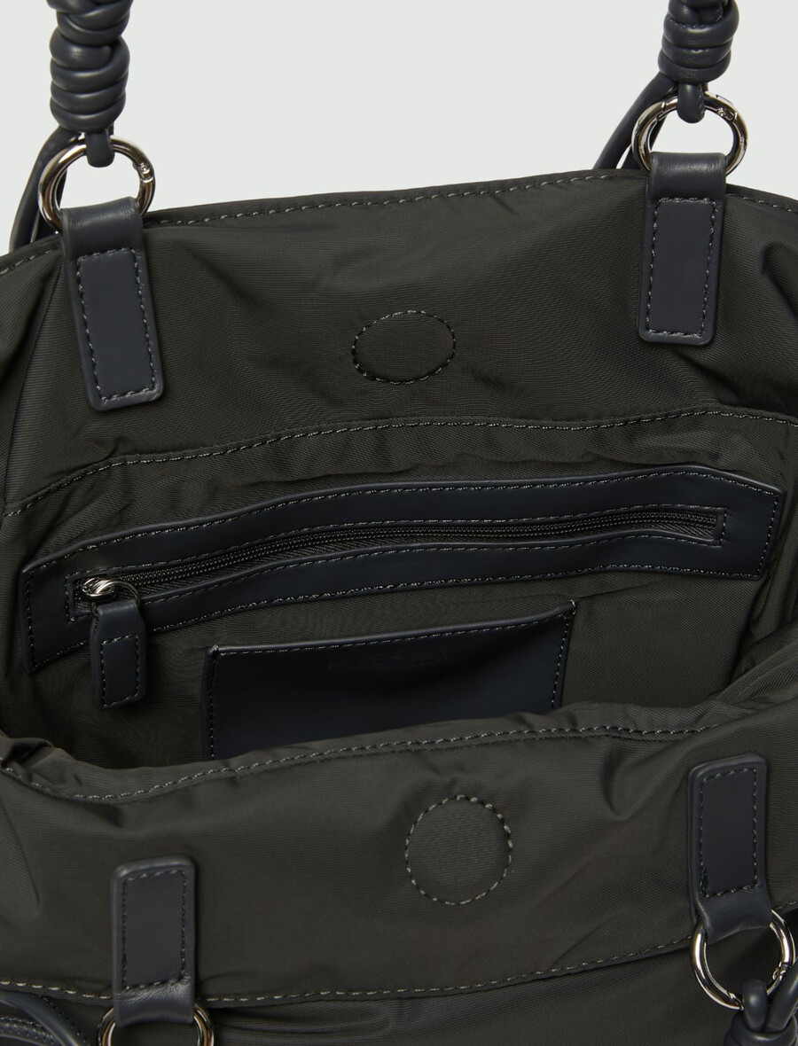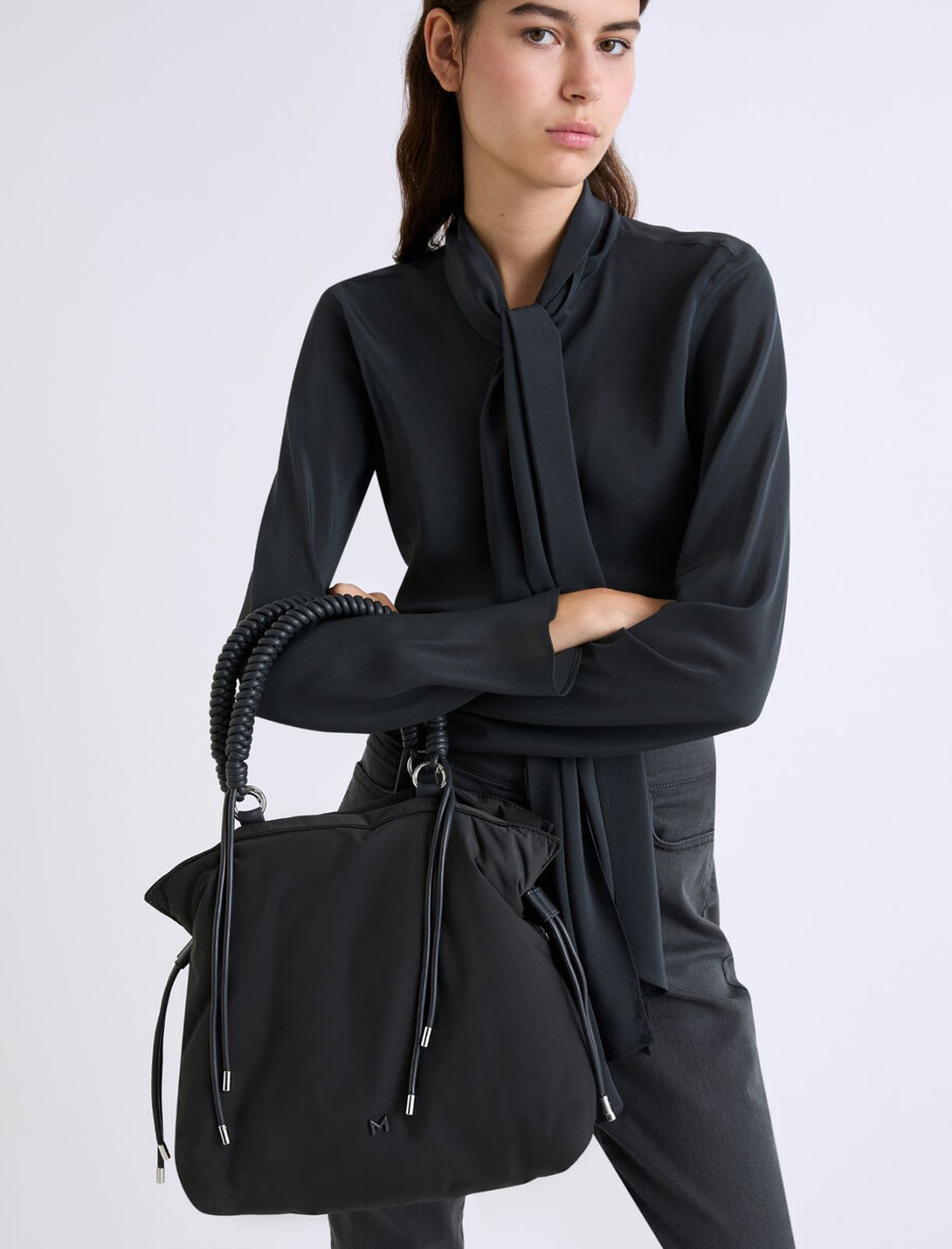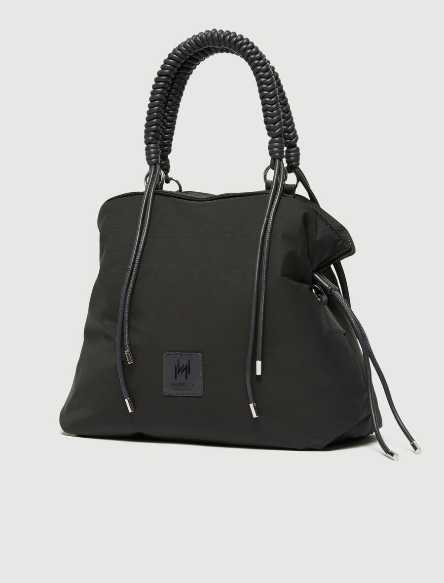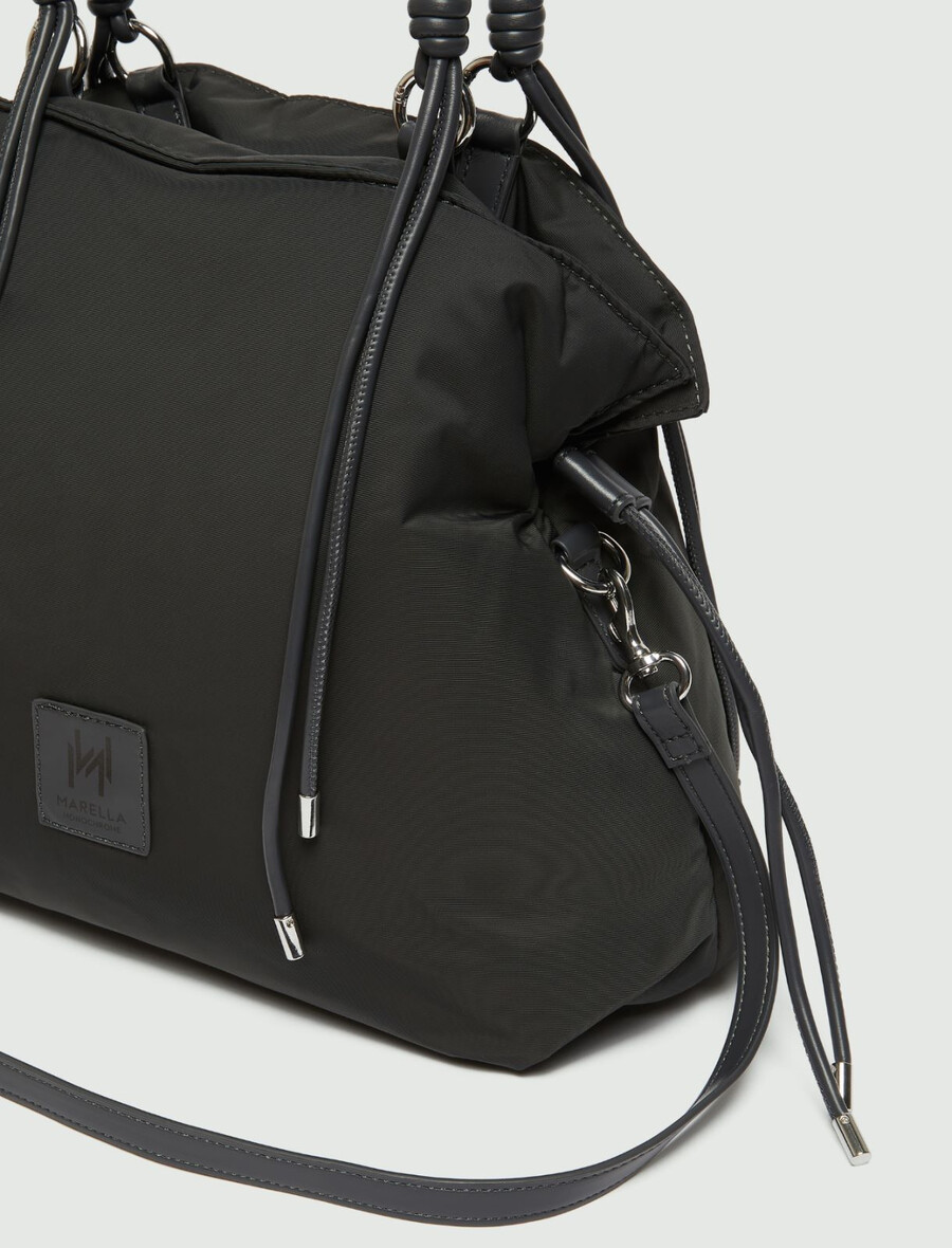 - Cabas en tissu technique rembourré avec fermeture magnétique et cordons de serrage latéraux.