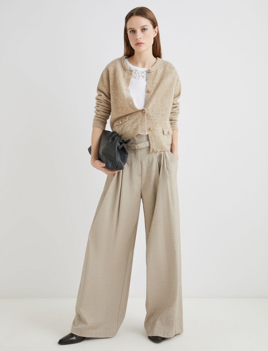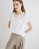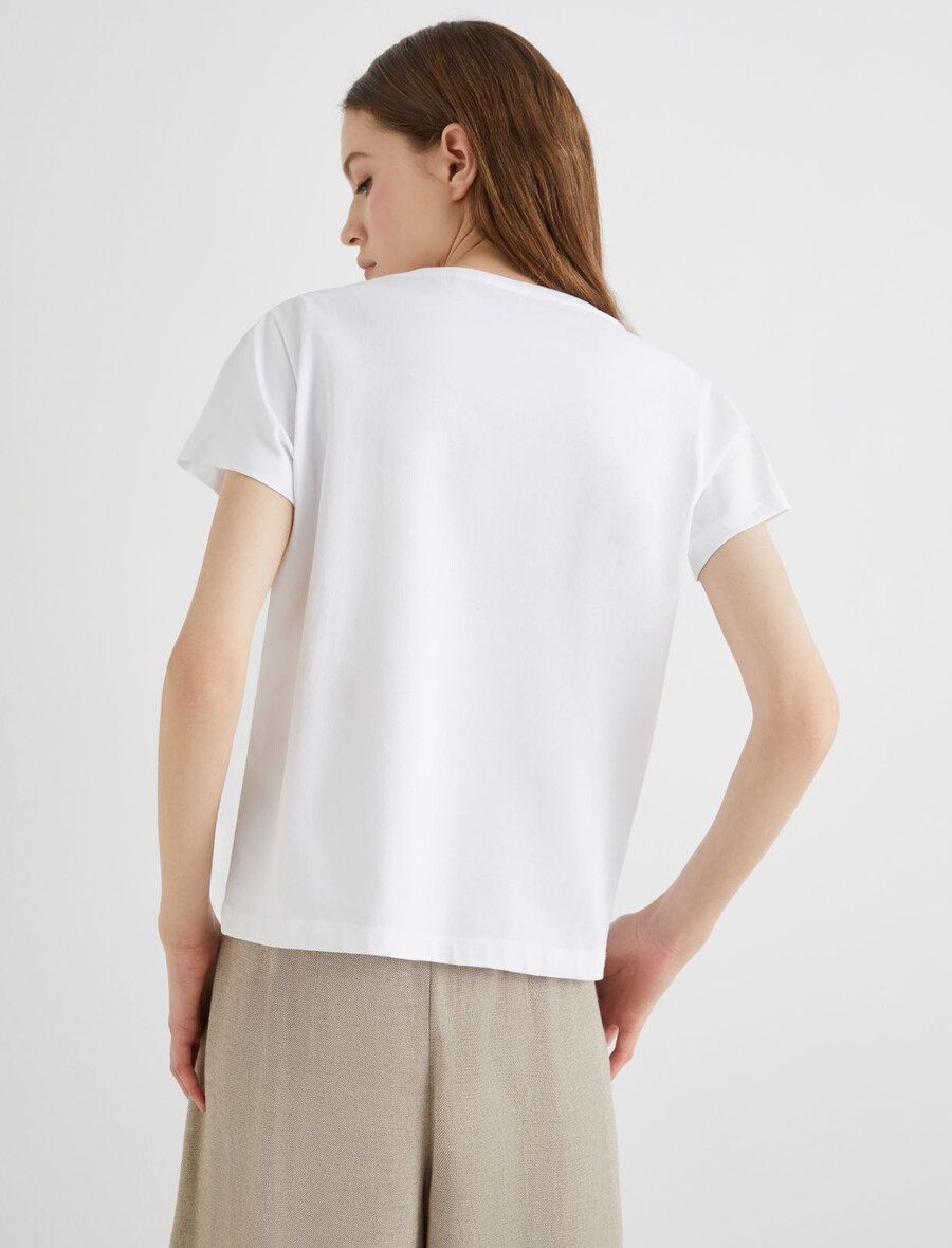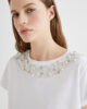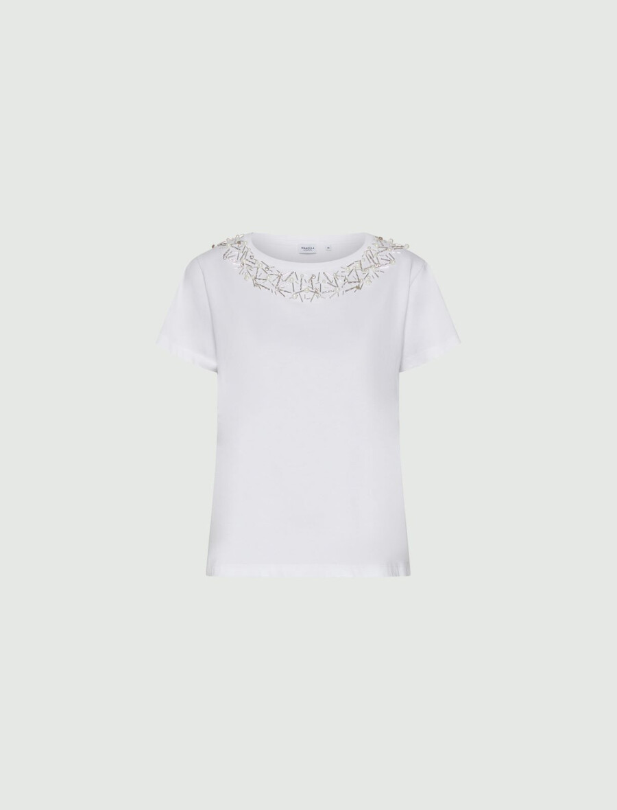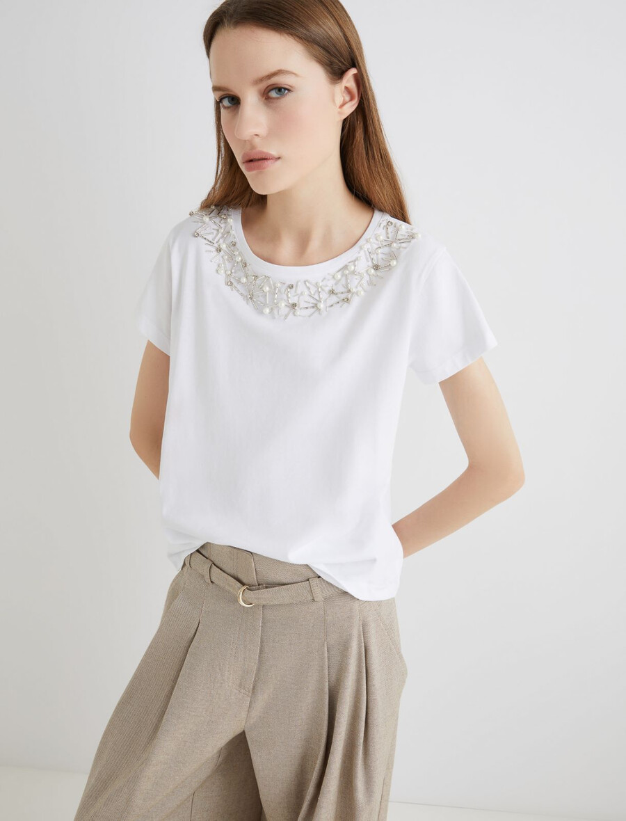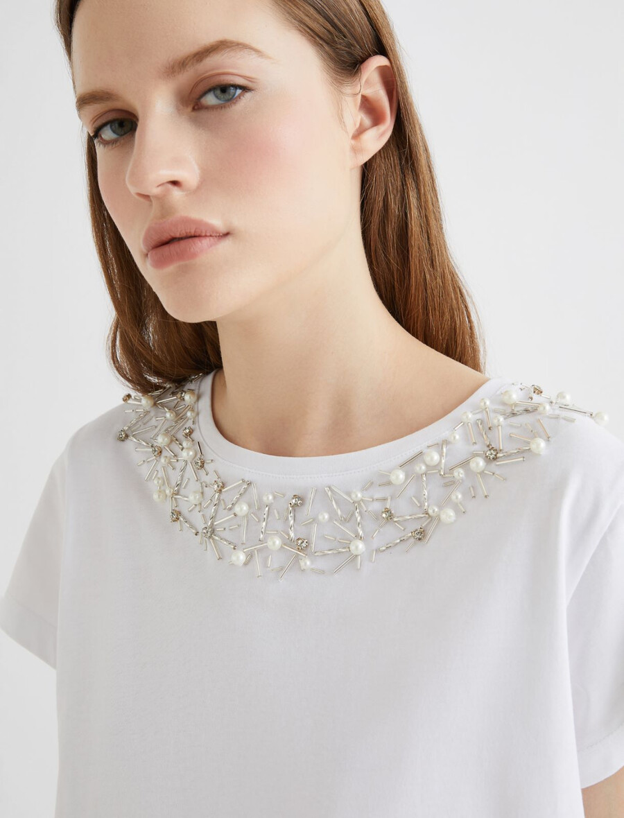 Le t-shirt en jersey de coton est toujours un succès. Surtout lorsque l’encolure est ornée de perles de verre brodées et de cabochons de cristal.