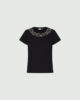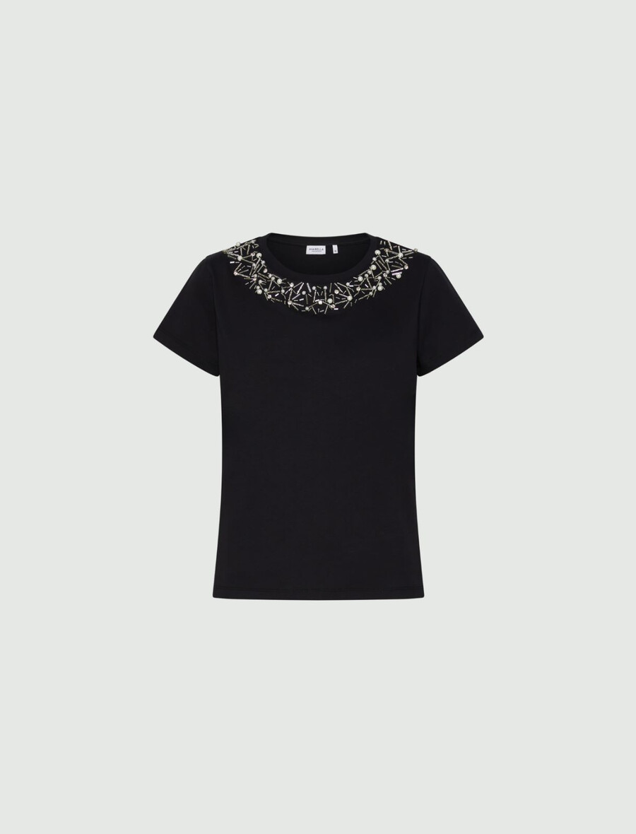 Le t-shirt en jersey de coton est toujours un succès. Surtout lorsque l’encolure est ornée de perles de verre brodées et de cabochons de cristal.