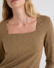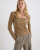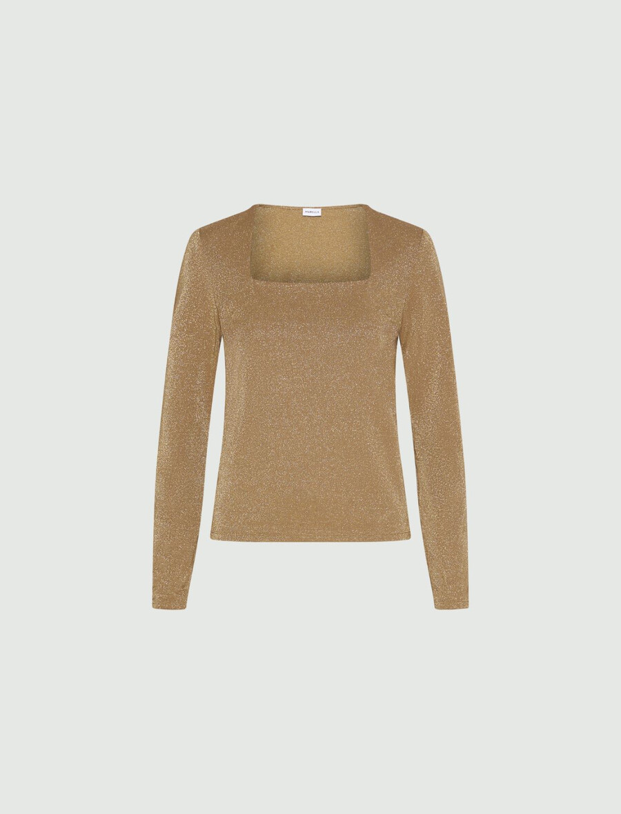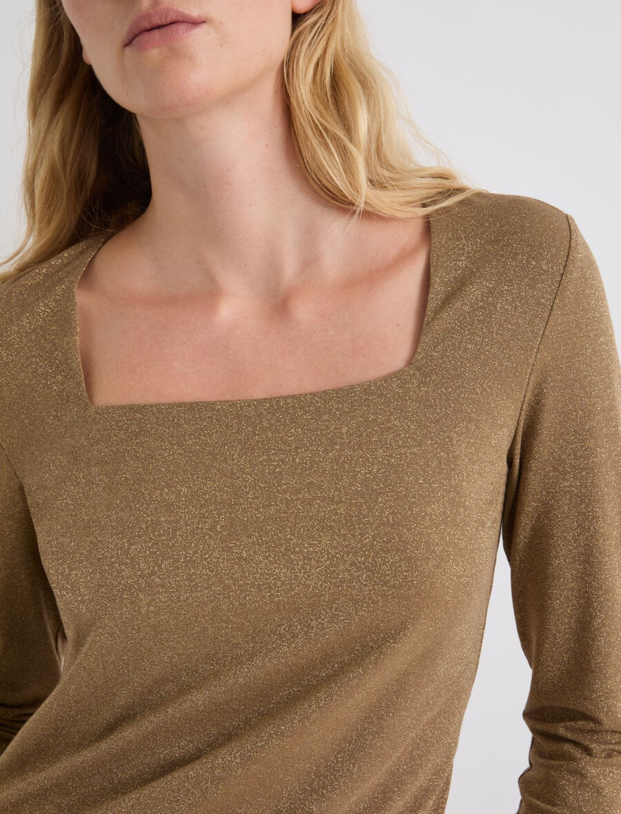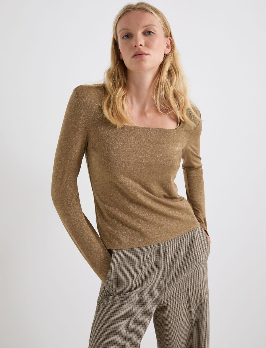 Un t-shirt à manches longues revisité avec un large col carré et des fils de lurex scintillants dans la trame.