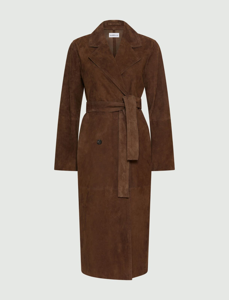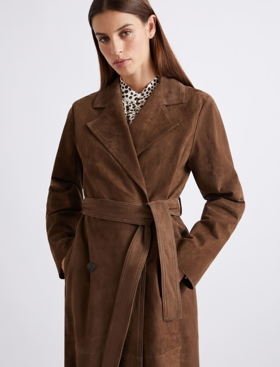 Une version urbaine d’une icône de style : l’élégant et intemporel trench-coat croisé se décline en daim souple. Sa coupe décontractée épouse la silhouette et se marie à la perfection avec sa ceinture assortie.