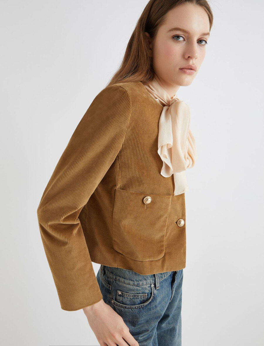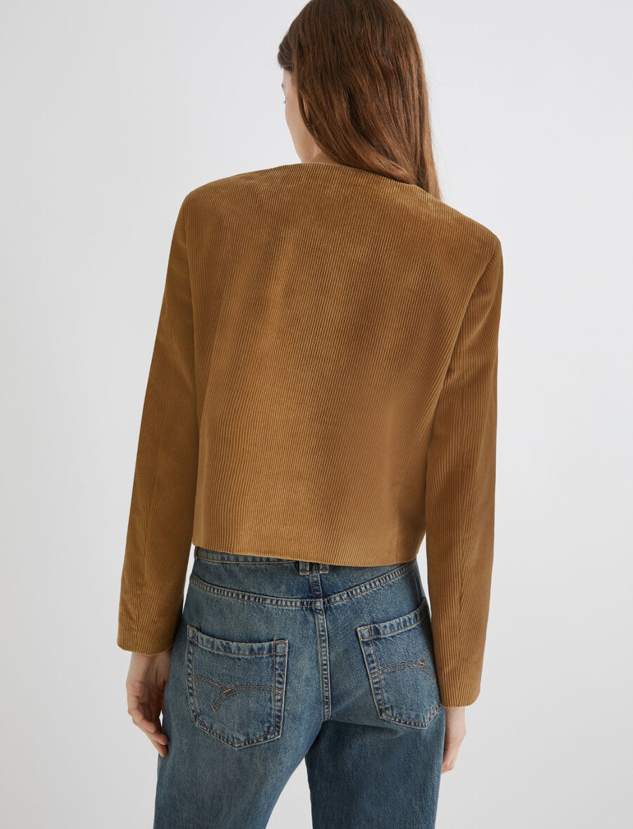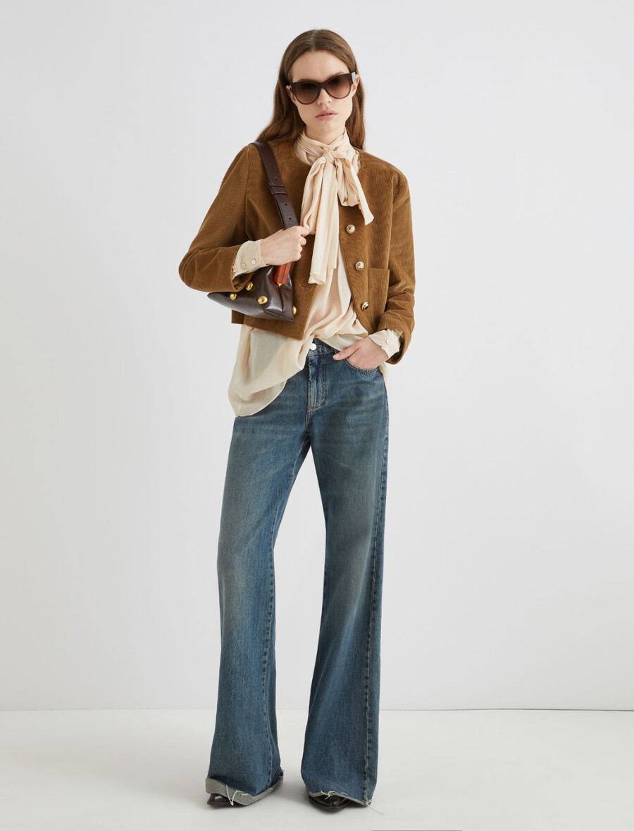 Une touche seventies et une coupe courte à la taille : la nouvelle veste carrée allie inspirations et tendances pour un look résolument cool. À porter avec un jean évasé et une chemise fluide.