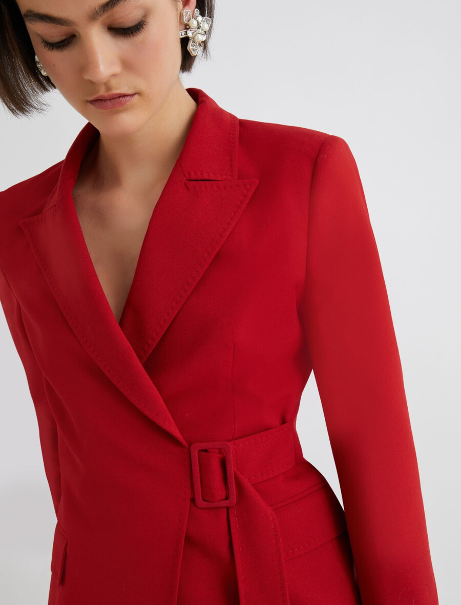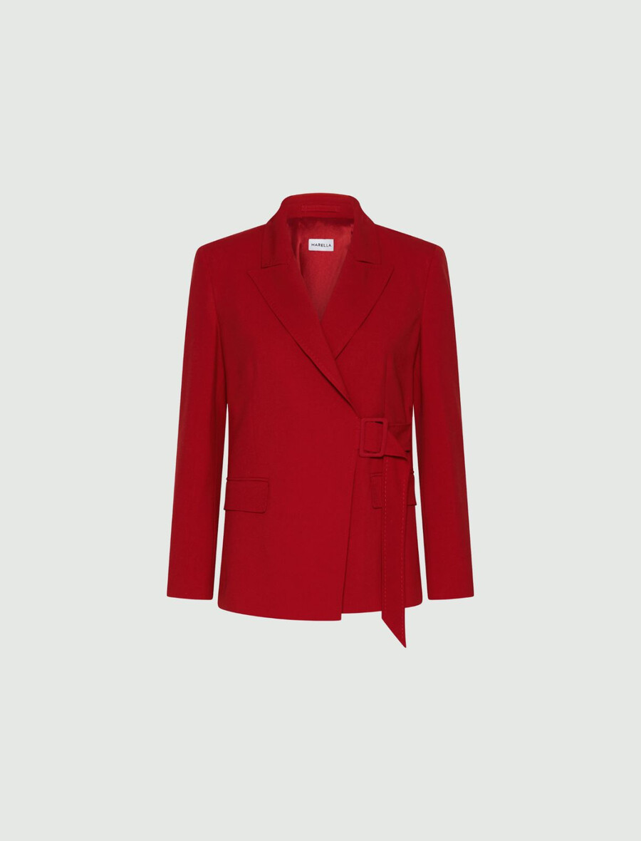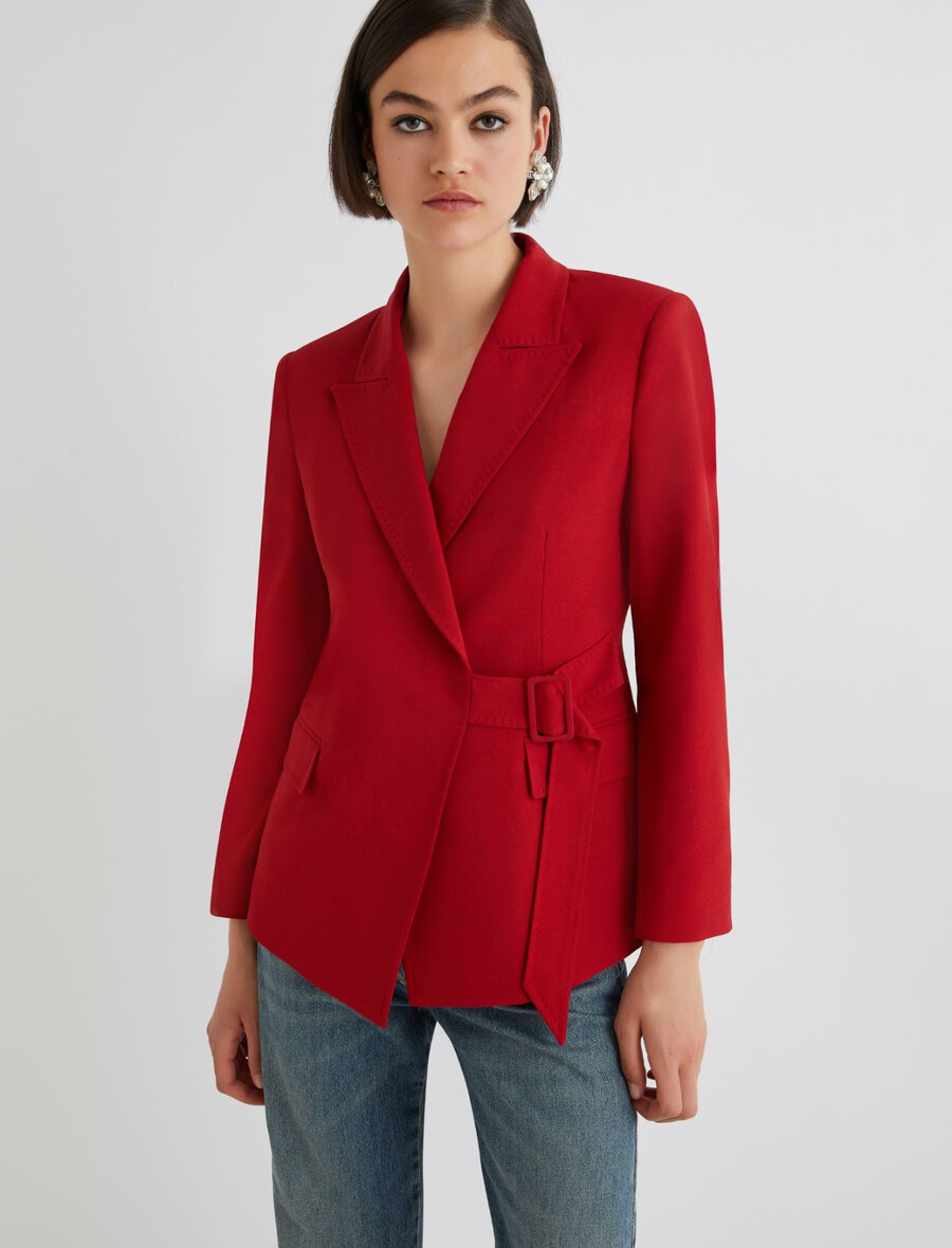 Cette nouvelle veste cintrée se distingue par ses nuances vibrantes et son design original. La ceinture à boucle latérale lui confère une allure résolument féminine.