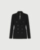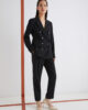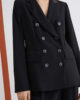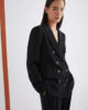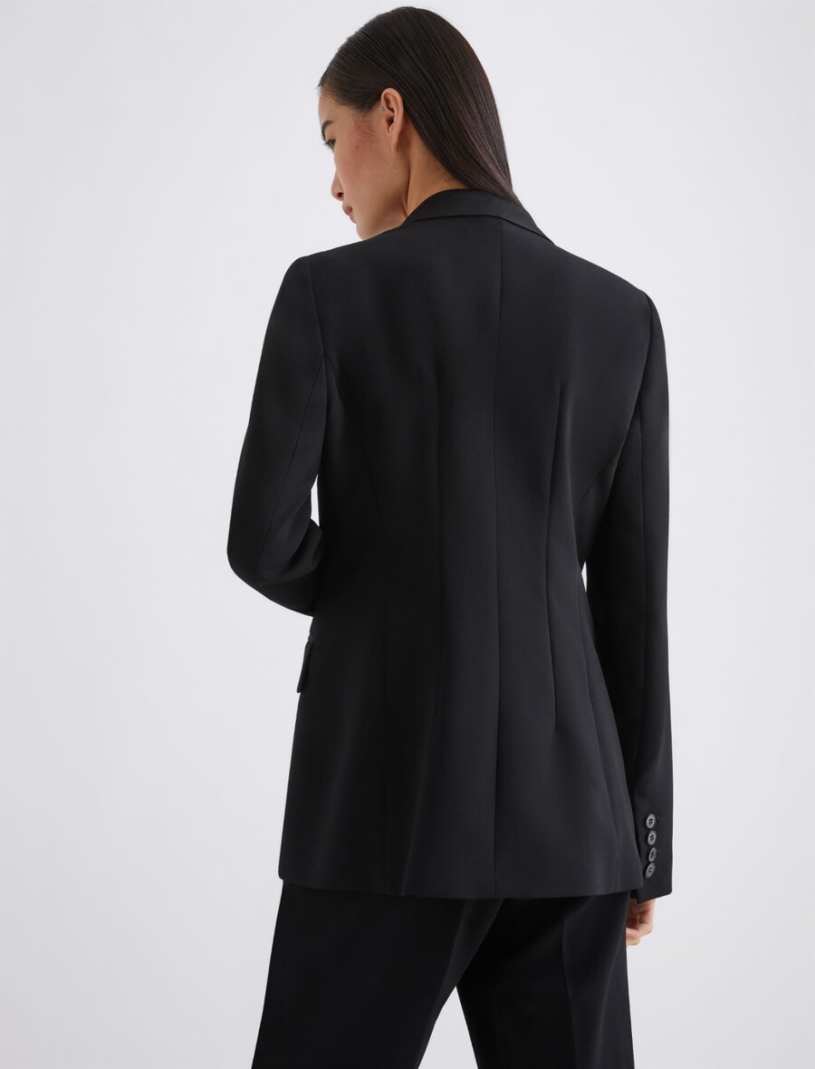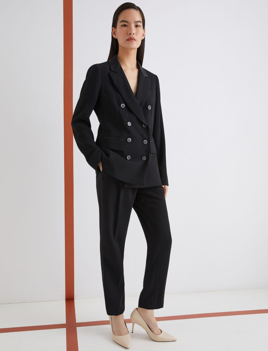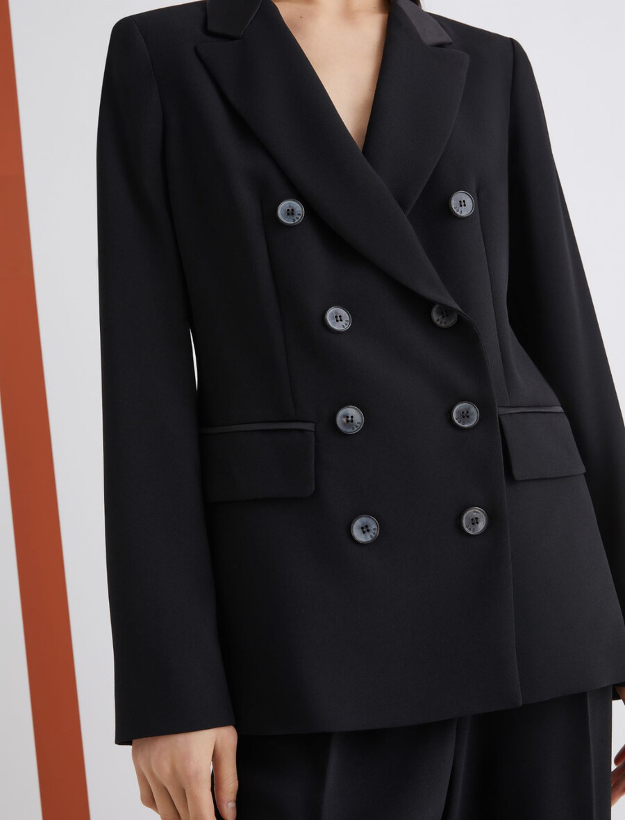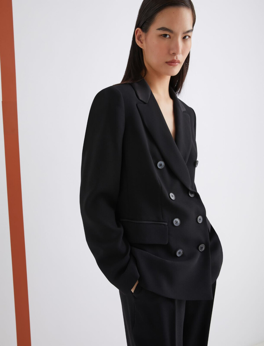Cette veste de tailleur croisée se distingue par son caractère affirmé et son allure citadine. La touche de satin brillant à l’encolure évoque l’élégance d’un smoking, créant ainsi un modèle à porter en toutes occasions avec des pantalons et des jupes assortis.